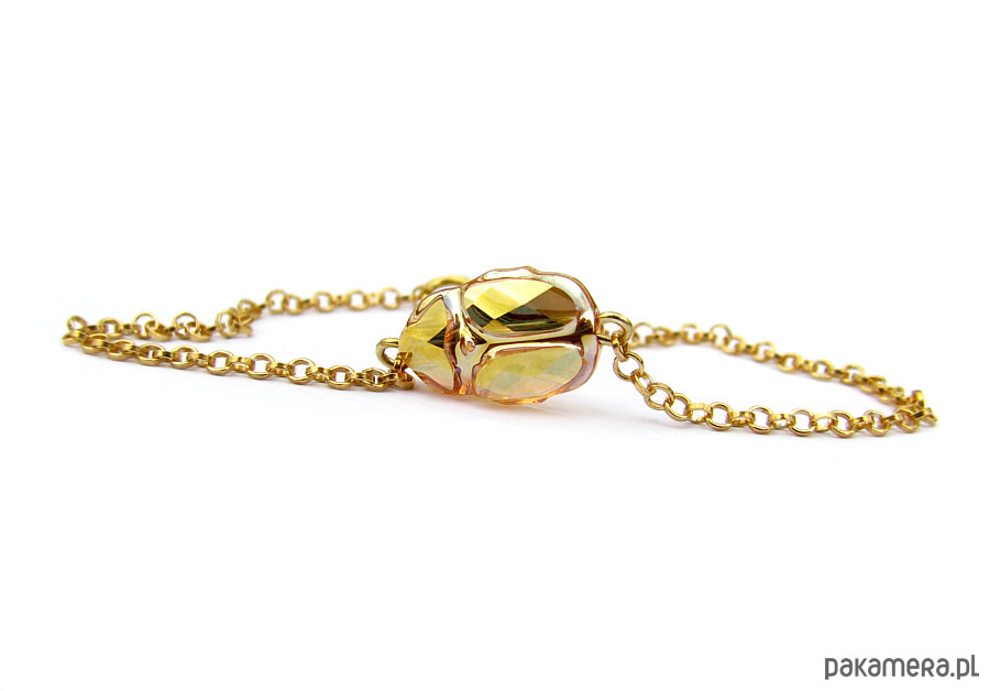 Wykonałam ją na bazie cienkiego, pokrytego warstwą 24-karatowego złota srebrnego łańcuszka (próba 925) o okrągłych ogniwkach, w jego środek wplatając oryginalny kryształek Swarovski - skarabeusza w odcieniu Metallic Sunshine, czyli najzłotszym złotym 🙂
