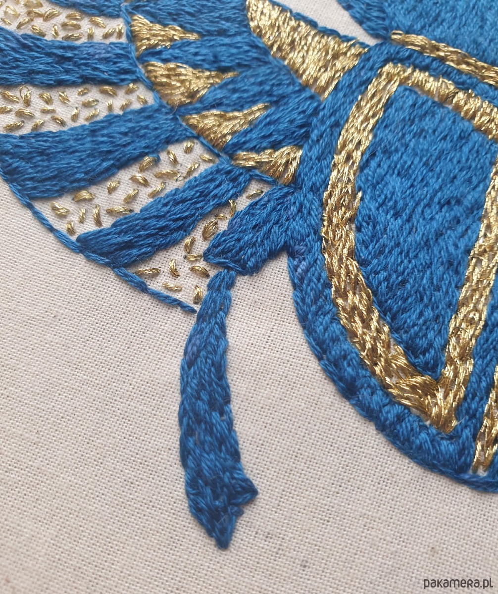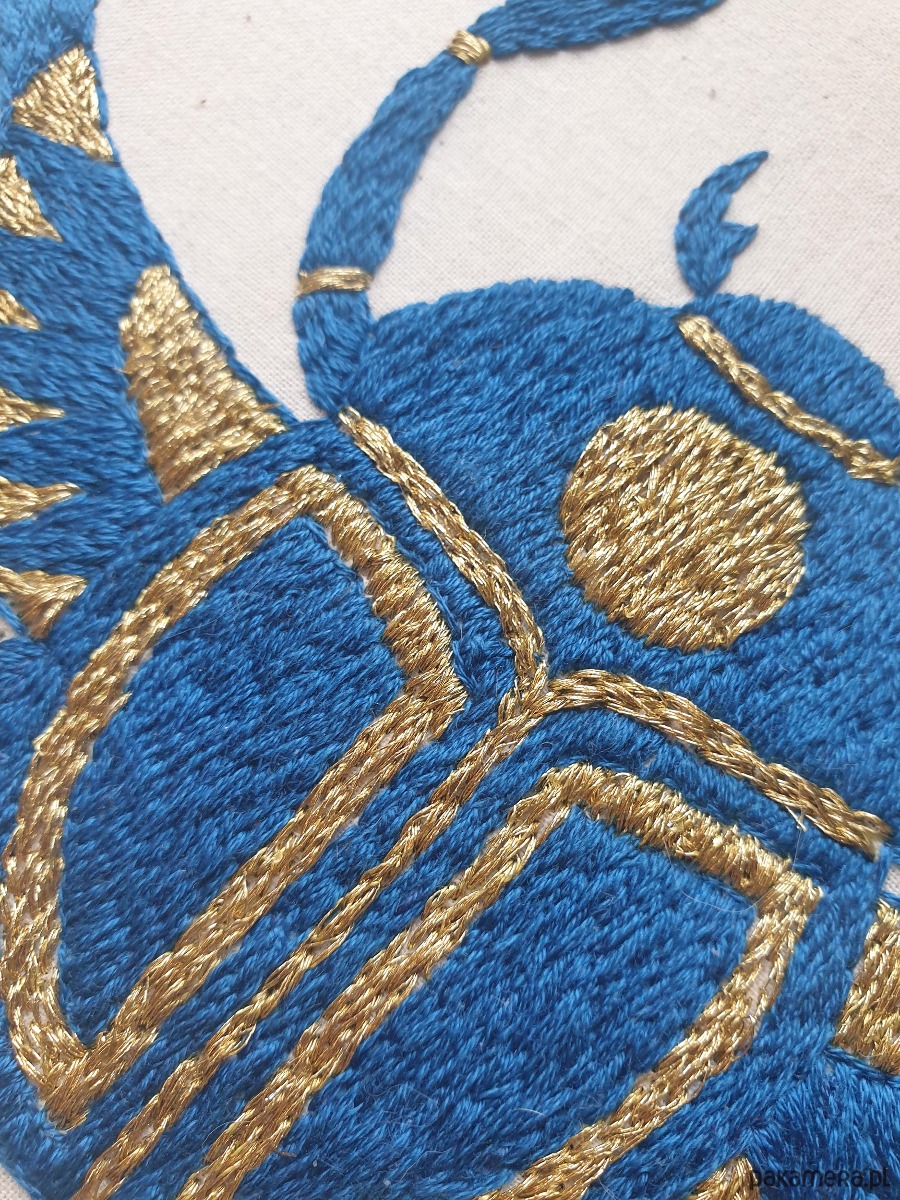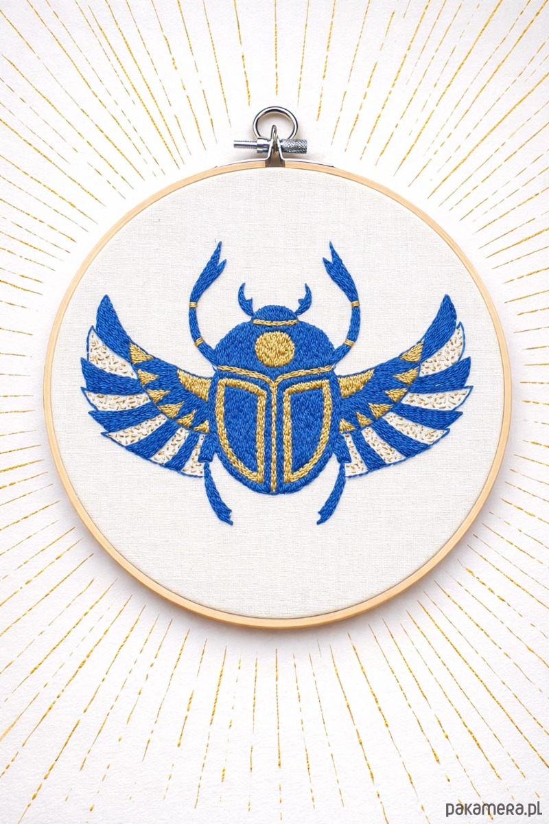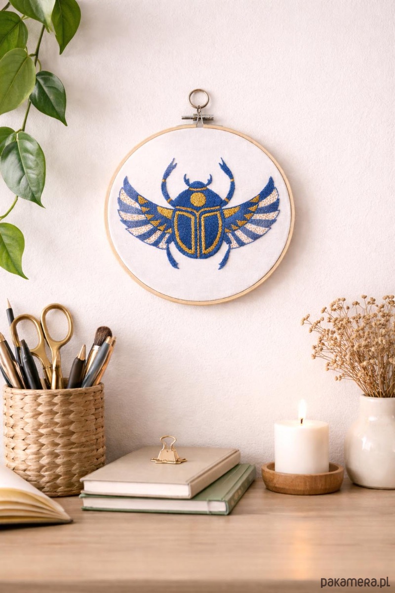 Skarabeusz w tamborku, talizman odrodzenia i twórczości.