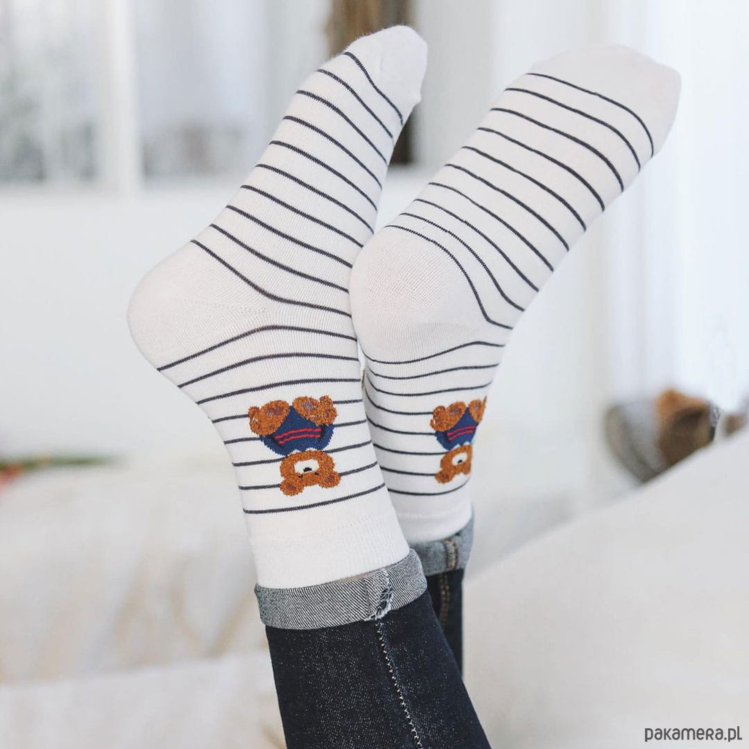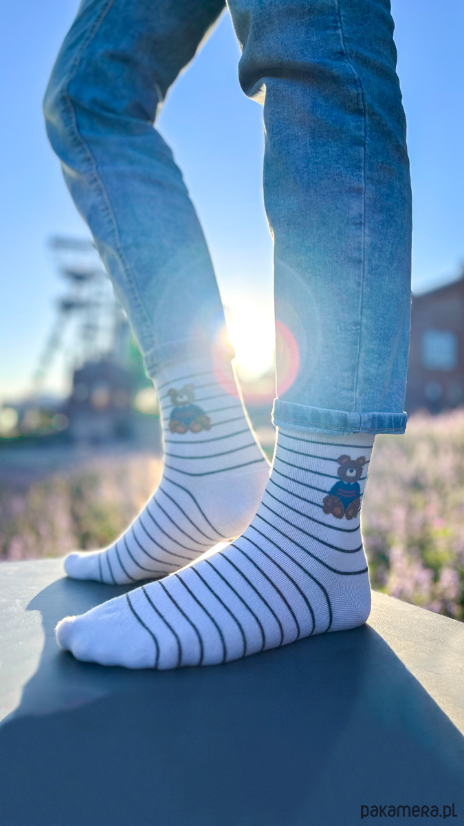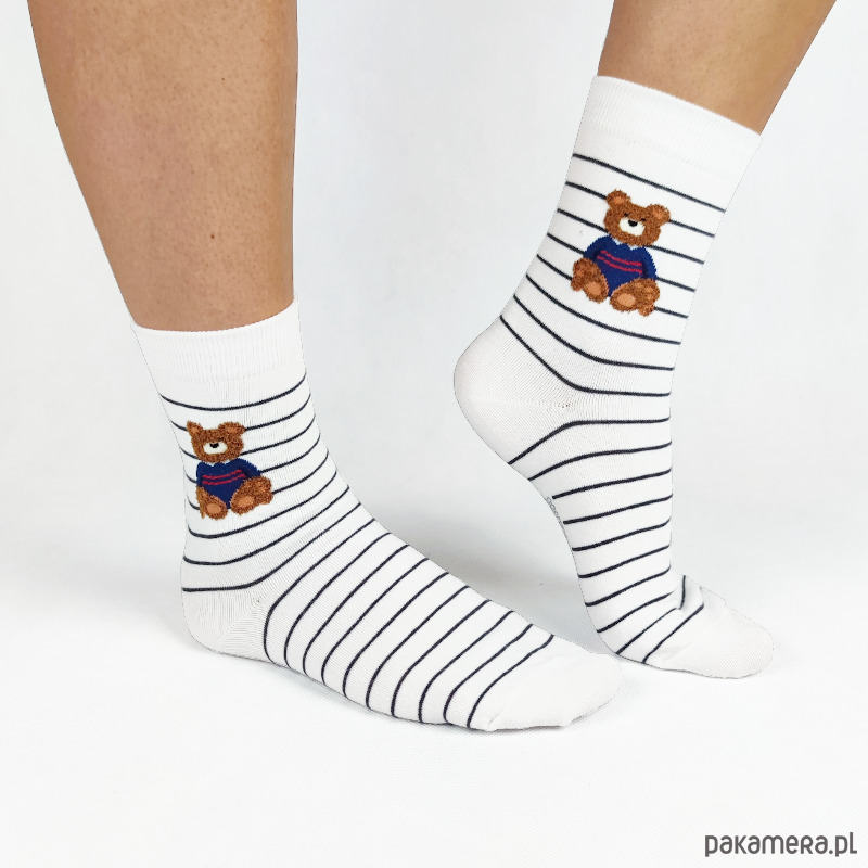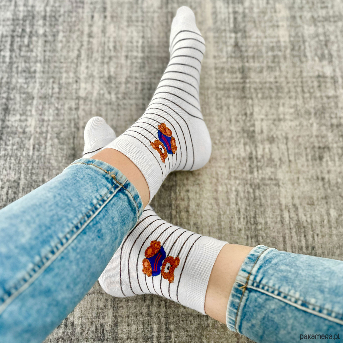 Damskie skarpetki w misie są śnieżno-białe, a dodatkowo mają paski, które nadają oryginalny design. Miś u kostki jest przyjemnie milutki - uszyty z innego materiału, co fantastycznie wygląda na nodze. W ofercie wiele więcej: skarpetki w świnki | skarpetki w pandy | skarpetki w koty | skarpetki dziecięce - sprawdź pozostałe zakładki.