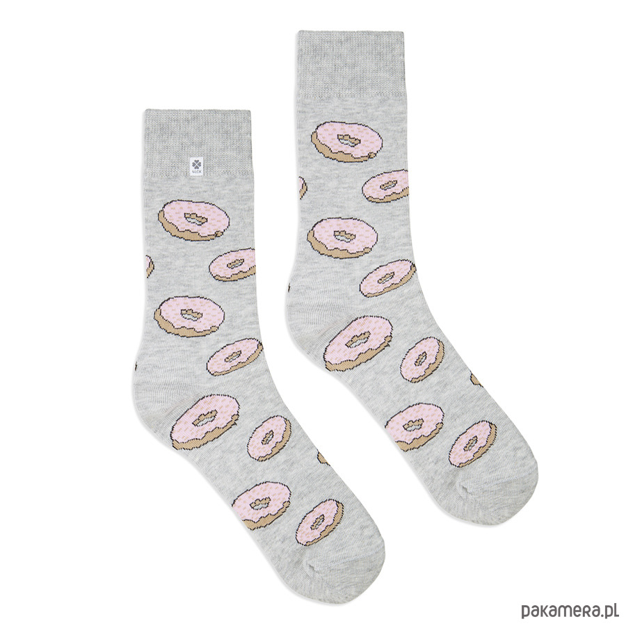 Kolorowe skarpetki damskie, szare w różowe pączki.