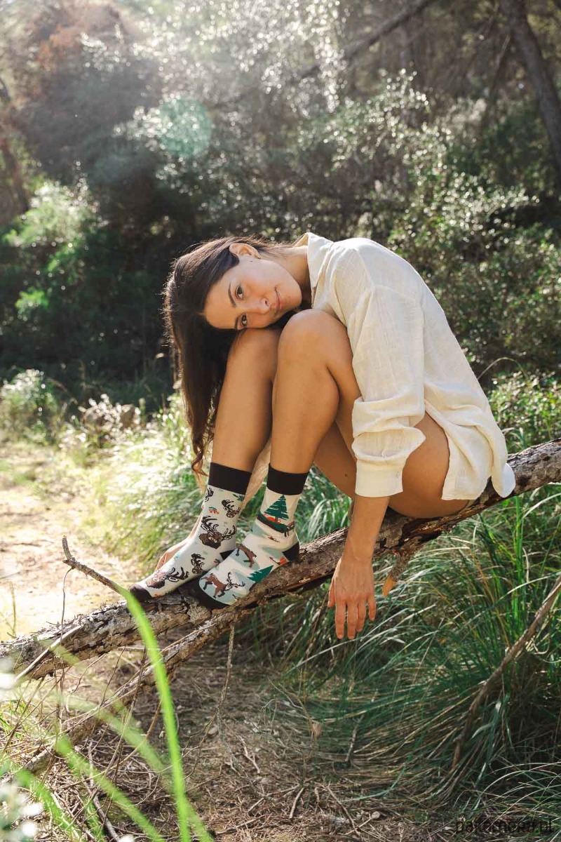 Pierwsza skarpetka ozdobiona jest majestatycznymi głowami jeleni z imponującym porożem, w towarzystwie paproci i soczystych jeżyn. Druga skarpetka przedstawia jelenie na leśnej ścieżce – jedne rywalizują porożami, inne dumnie prezentują się na wzgórzu. Całość tworzy dynamiczny i wyrazisty wzór, który ukazuje zarówno spokój, jak i ruch w naturalnym środowisku tych pięknych zwierząt. Stonowana paleta barw sprawia, że skarpetki w jelenie są uniwersalne i świetnie komponują się z codziennymi stylizacjami. Brąz nawiązuje do sierści jeleni, zieleń do różnorodnego poszycia leśnego, a delikatny beż i subtelne czerwone detale dopełniają całość przyjemnym kontrastem.