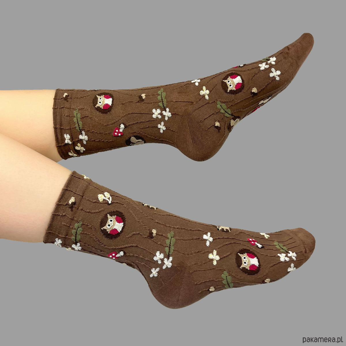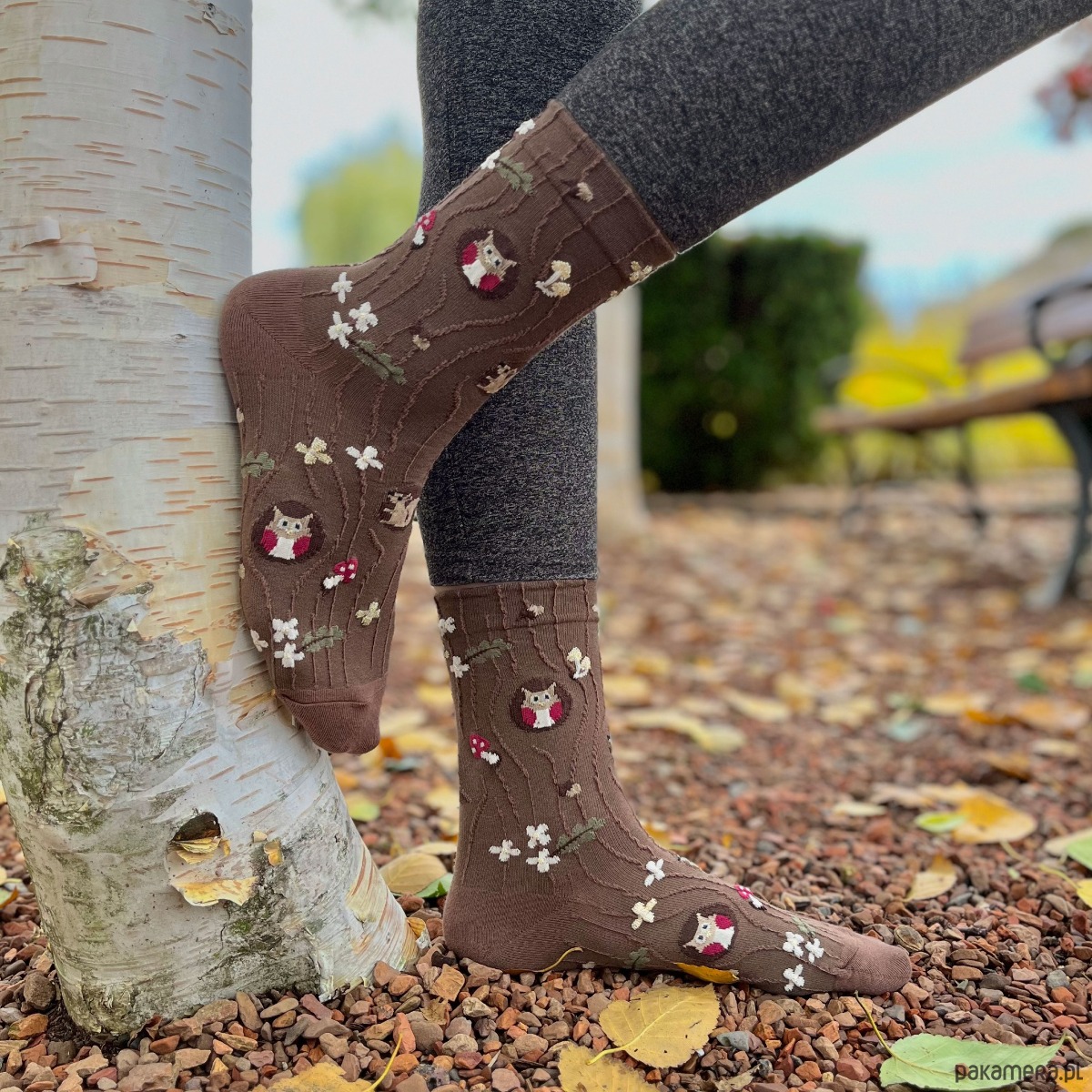Na tych skarpetkach znajdziesz szczegółowo odwzorowane drzewo z dziuplą, z której wygląda urocza sówka. Naturalna kolorystyka ziemi i czekoladowego brązu sprawia, że pasują do wielu stylizacji – szczególnie tych jesiennych i leśnych. Na szczególną uwagę zasługują niewielkie, czerwone muchomory, które podkręcają naturalną kompozycję skarpetek z motywem drzewa i sowy.