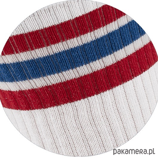 - kolor: białe, z czerwonymi i niebieskimi paskami