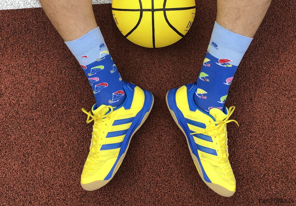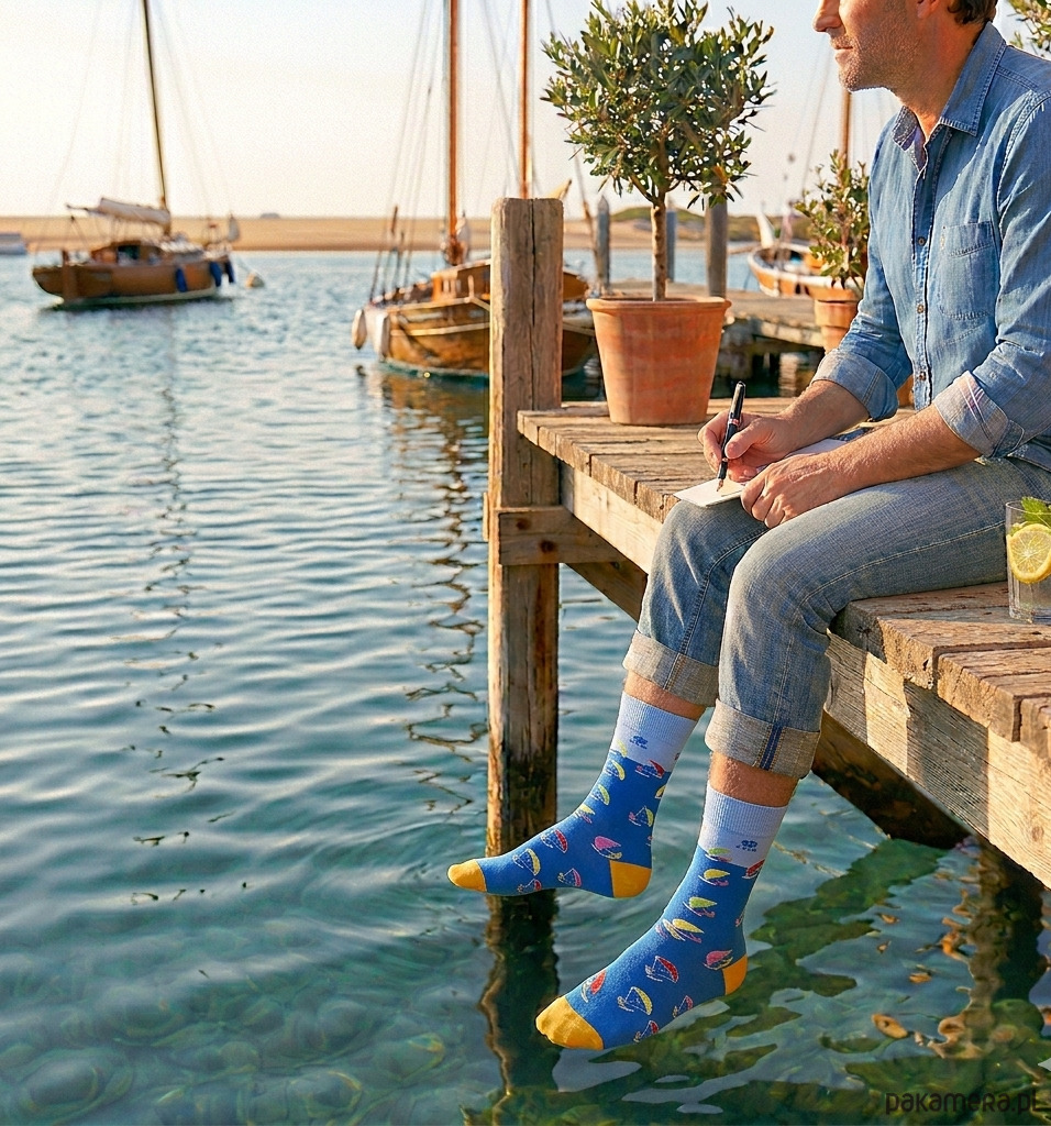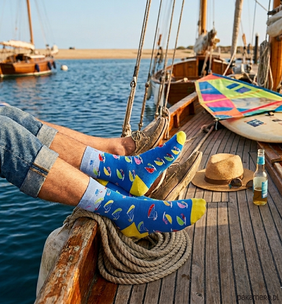 Śmieszne kolorowe skarpetki dla fanów sportów wodnych. Będąc nad morzem nieraz widziałeś deski z żaglem aż po horyzont, a niebo pełne kolorowych latawców. Nie ma to jak wiatr i woda :)