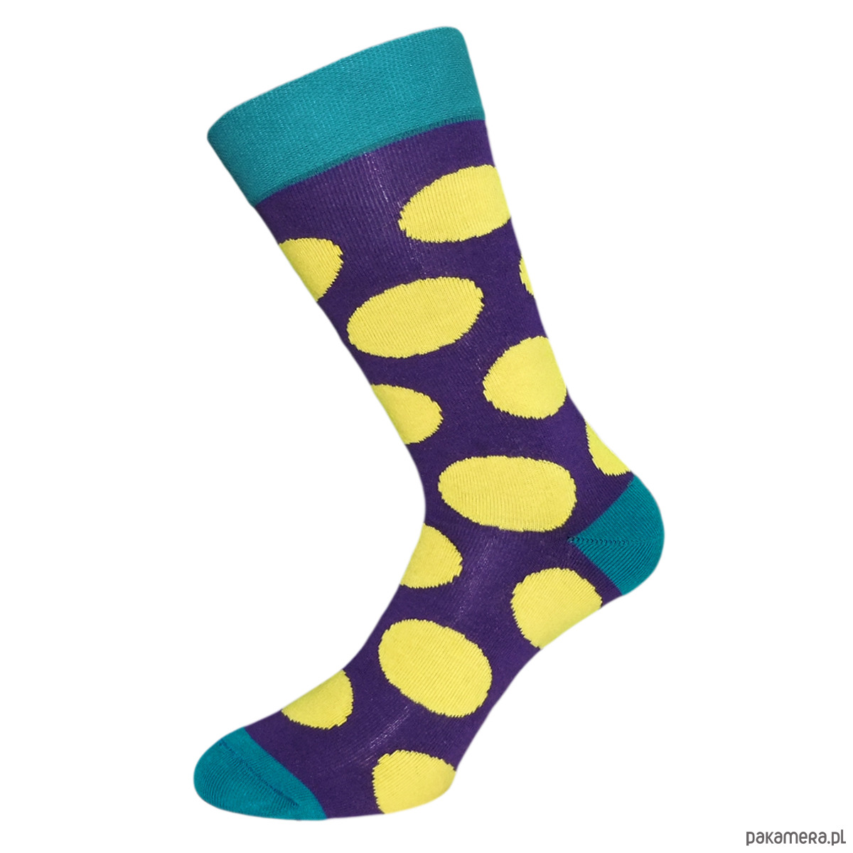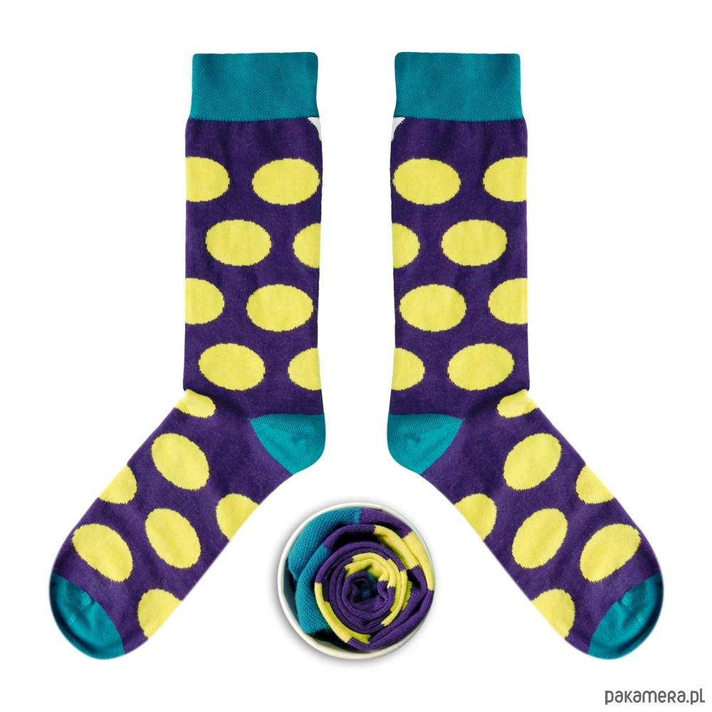 Trójkolorowe, bawełniane skarpetki o bardzo uniwersalnym zastosowaniu. Głęboki fiolet wraz z ciekawym odcieniem niebieskiego został świetnie zaakcentowany dużymi, żółtymi grochami. Wzorowanie na całej skarpecie będzie widoczne nawet przy obuwiu o dłuższej cholewce. Model szczególnie atrakcyjnie będzie wyglądał wraz dżinsami.