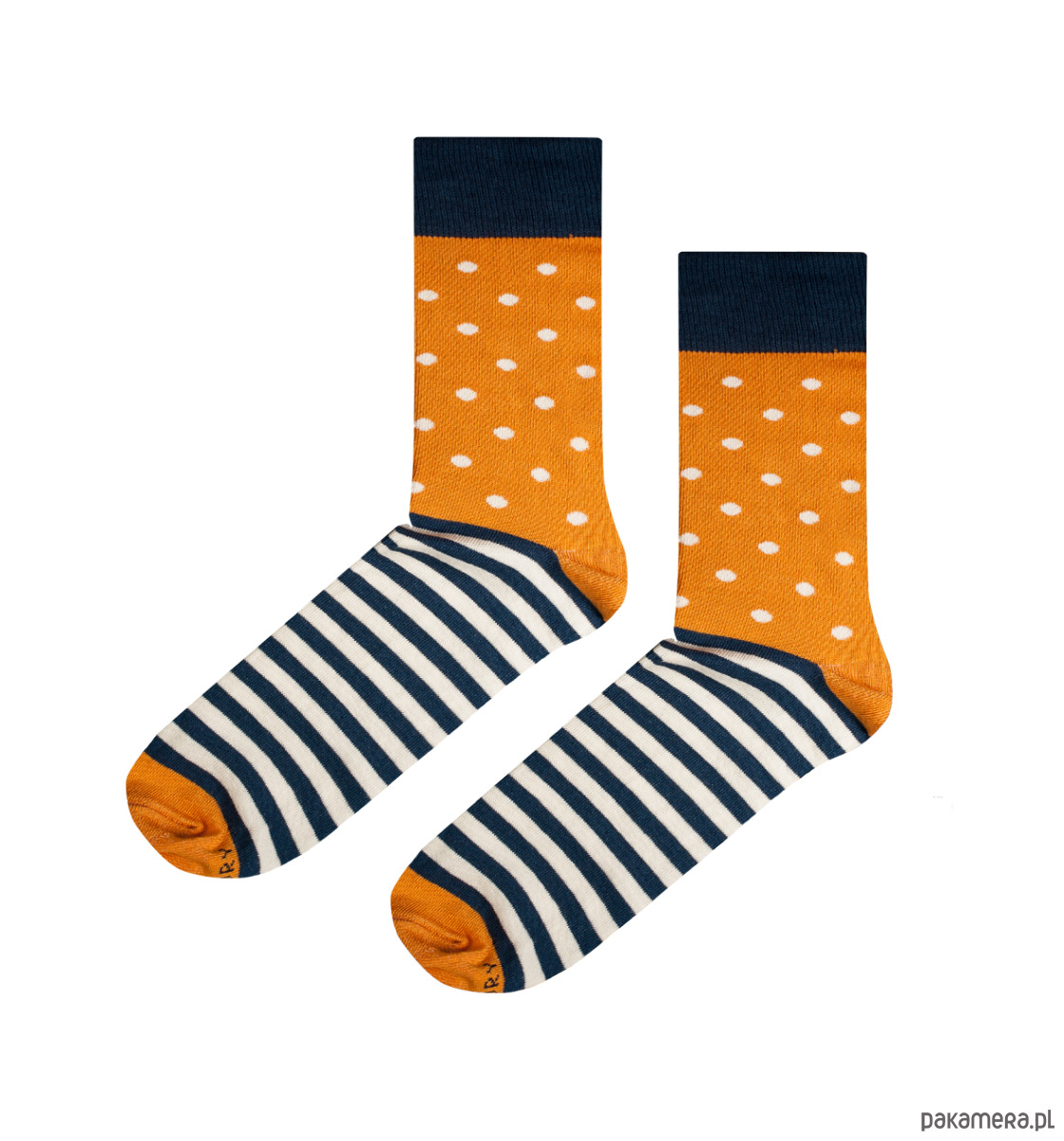 Musztardowe skarpetki z kremowymi kropeczkami na górze i kremowo-granatowymi paseczkami na dole