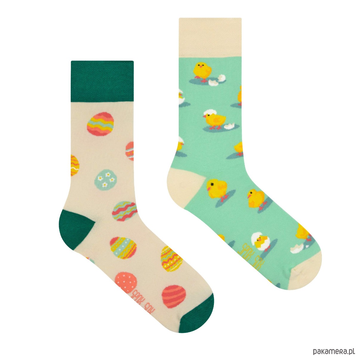 Nasze skarpetki nie do pary zachwycają pastelową paletą barw i prawdziwie wiosennym klimatem. Jedna skarpetka ozdobiona jest barwnymi pisankami pełnymi delikatnych wzorów – kropek, paseczków i szlaczków. To znajome techniki malowania, które niejeden z nas testował przy wielkanocnym stole! Druga przedstawia urocze pisklęta wykluwające się z jajek, które właśnie rozpoczynają swoją wielkanocną przygodę.