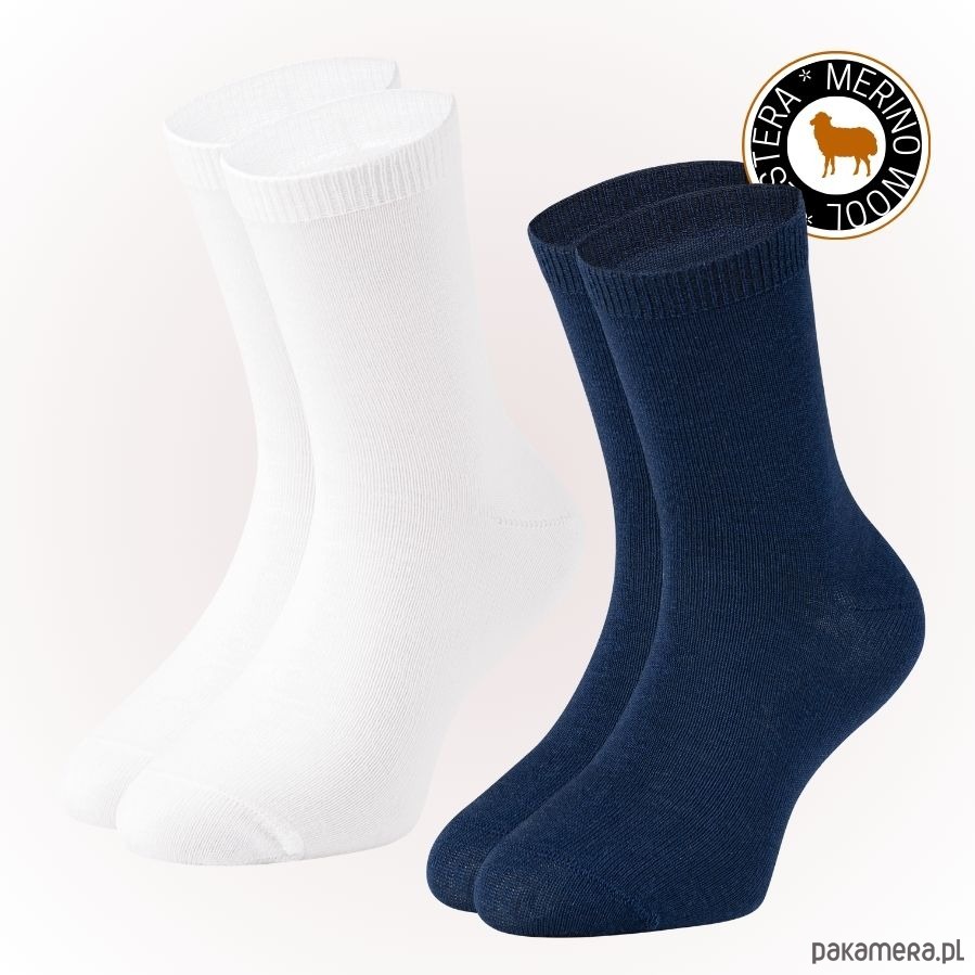 Białe i granatowe skarpetki z wełny merynosowej dla dzieci. 2 pary skarpet z naturalnej wełny merynos.