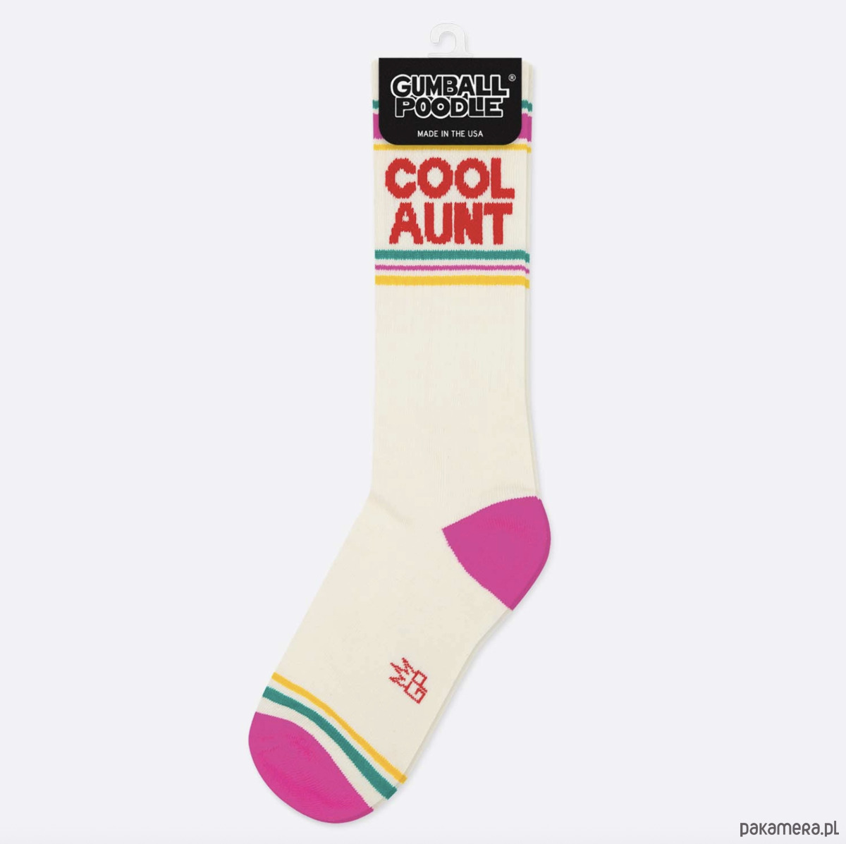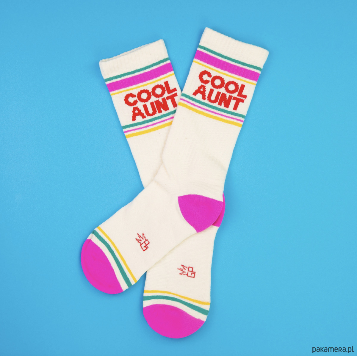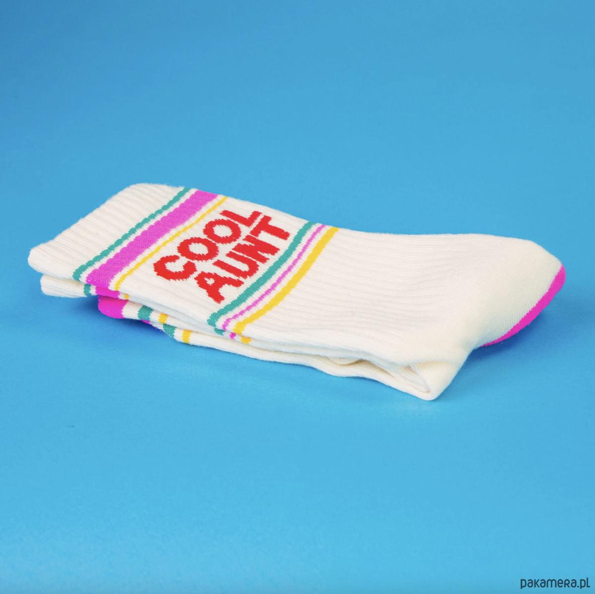 Skarpety utrzymane są w klasycznej estetyce "varsity" – kremowa baza z wyrazistymi, kolorowymi paskami w odcieniach różu, morskiej zieleni i słonecznej żółci. Napis „Cool Aunt” w jaskrawym czerwonym kolorze nie pozostawia wątpliwości, kto jest ulubioną krewną w towarzystwie.