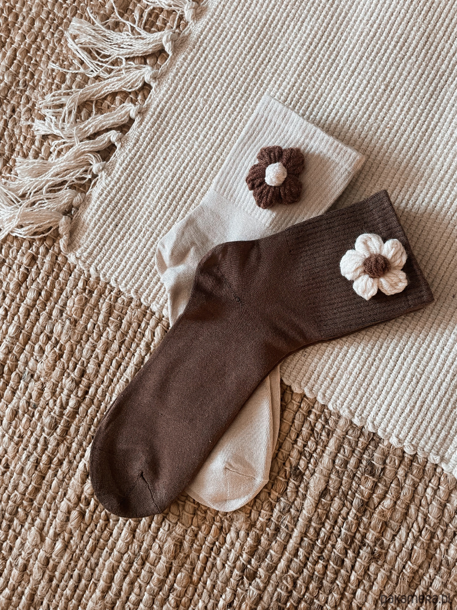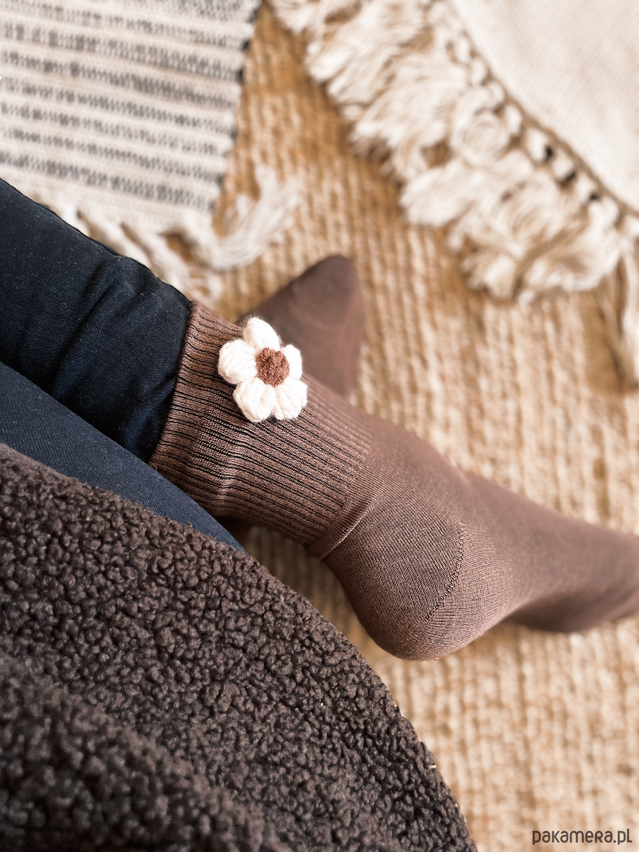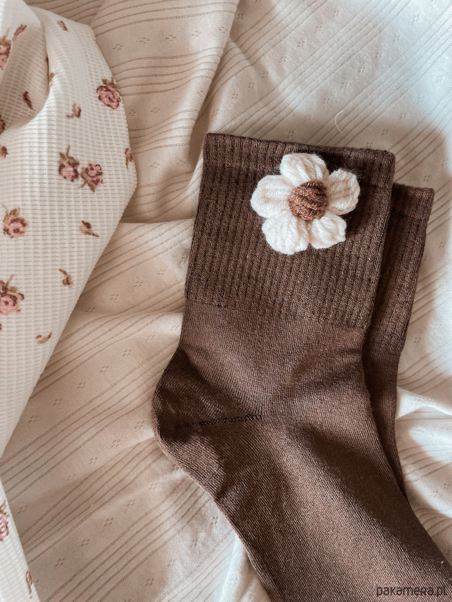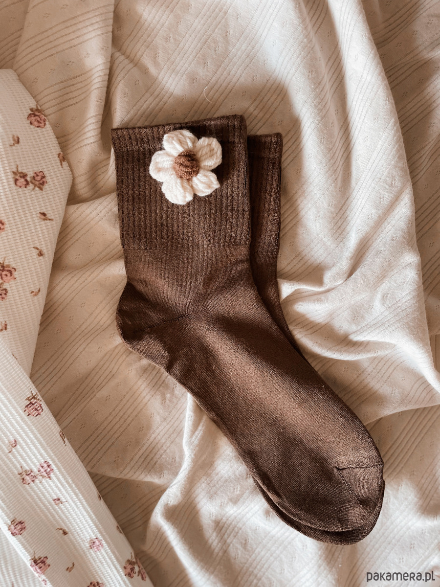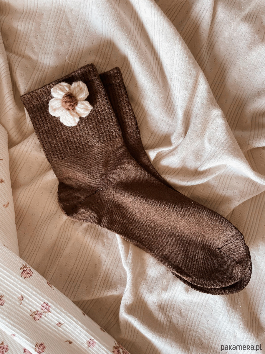 Brązowe skarpetki z dekoracyjnym kwiatkiem to delikatny akcent inspirowany naturą. Subtelna forma i ciepła kolorystyka sprawiają, że są idealnym dodatkiem do spokojnych, naturalnych stylizacji.