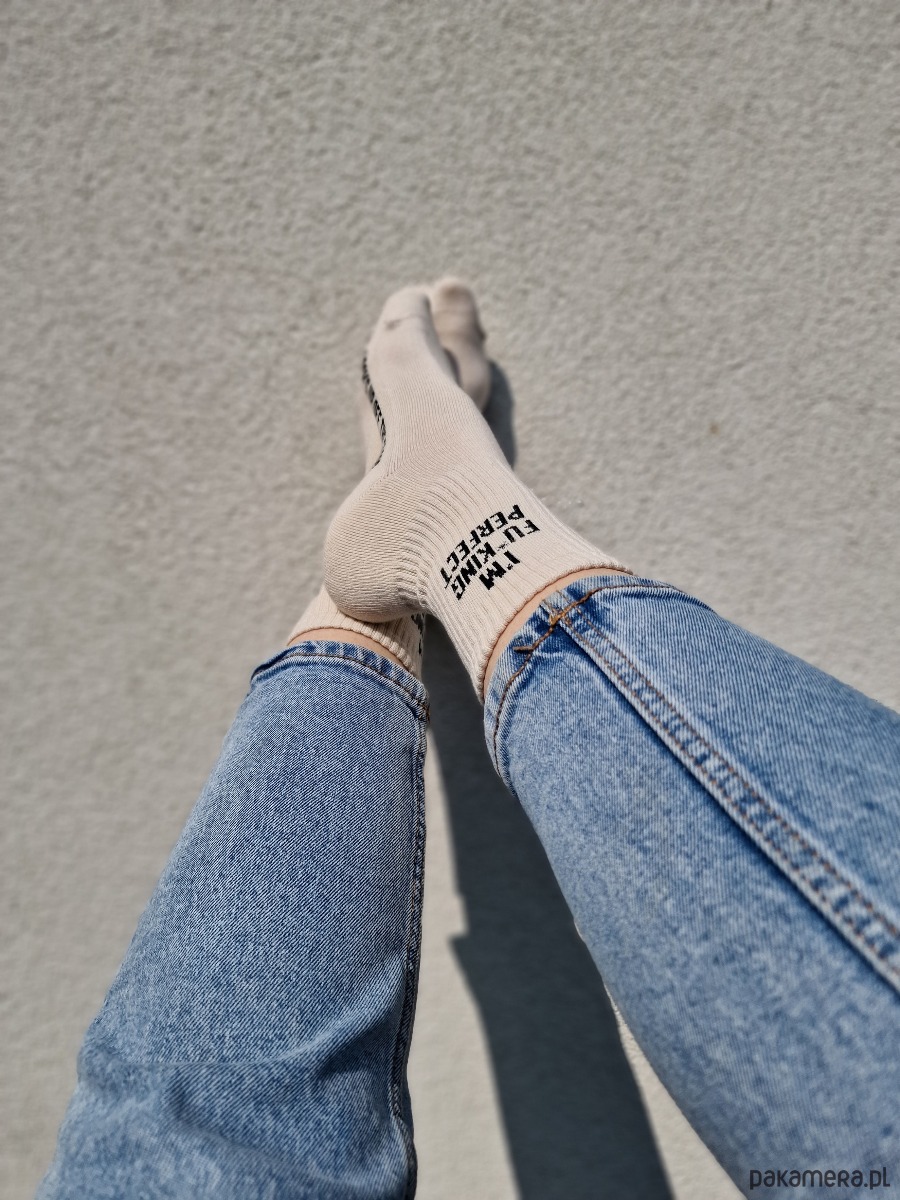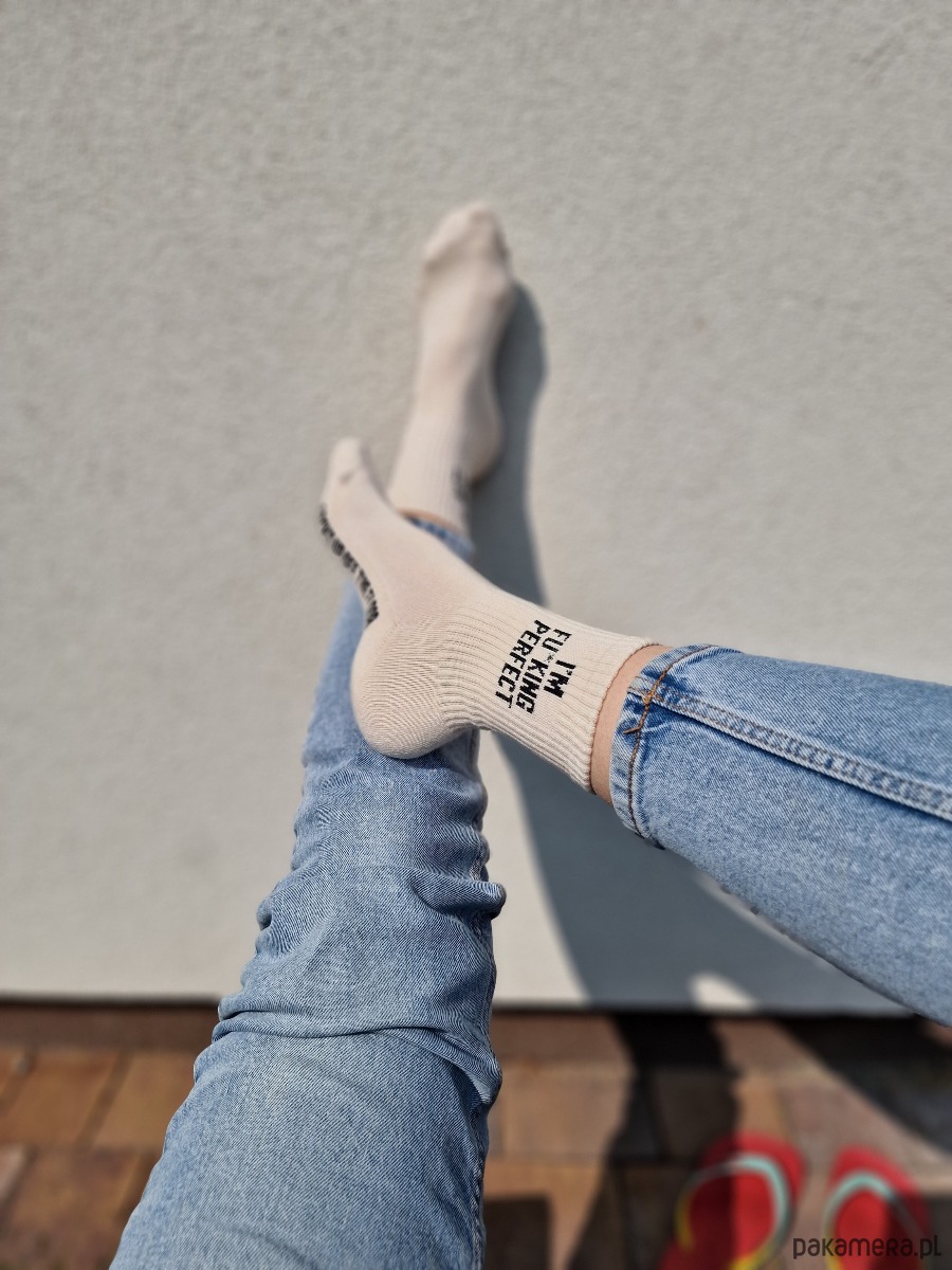 Te modne skarpetki damskie z napisem „I’M FU*KING PERFECT” od SOCKS UP OFF THE FLOOR to idealny wybór dla kobiet, które wiedzą, kim są – i nie zamierzają tego ukrywać. Odważne, stylowe, śmieszne i cholernie wygodne. W kolorze ecru, z wyraźnym czarnym napisem – idealne do sneakersów, jeansów, a nawet dresu na domówkę.