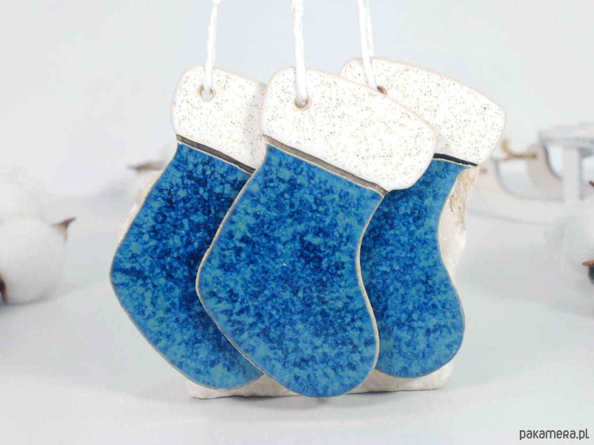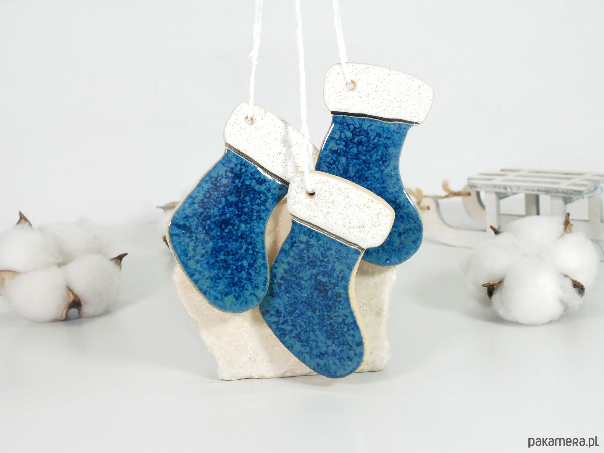 Ręcznie wykonane ceramiczne zawieszki w kształcie świątecznych skarpet w pięknym, głębokim odcieniu niebieskiego to idealna dekoracja na choinkę, okno lub do świątecznych aranżacji domu. Każda skarpeta została szkliwiona unikatową mieszanką błękitów i granatu. To ozdoba, która doda wnętrzu świątecznego ciepła i świetnie sprawdzi się również jako drobny, oryginalny prezent.