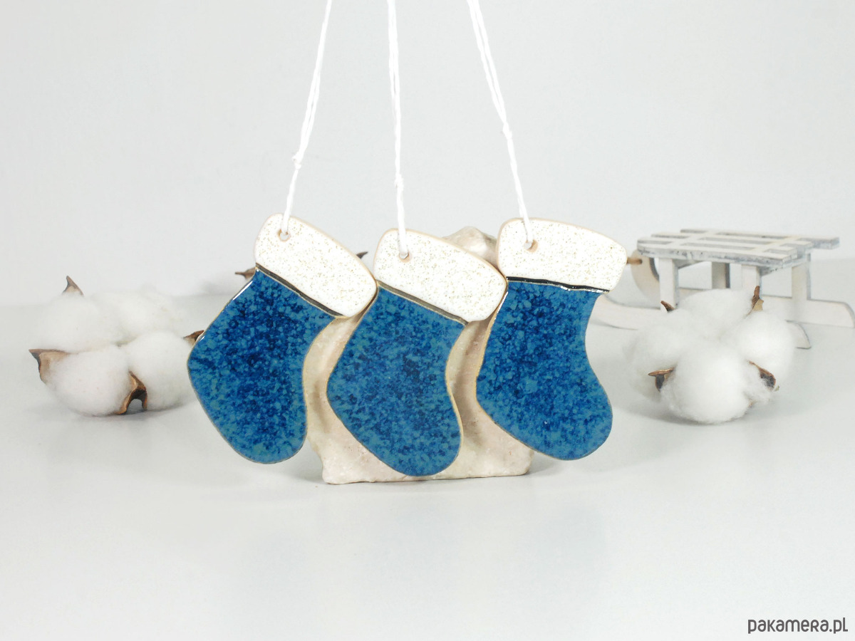 Ręcznie wykonane ceramiczne zawieszki w kształcie świątecznych skarpet w pięknym, głębokim odcieniu niebieskiego to idealna dekoracja na choinkę, okno lub do świątecznych aranżacji domu. Każda skarpeta została szkliwiona unikatową mieszanką błękitów i granatu. To ozdoba, która doda wnętrzu świątecznego ciepła i świetnie sprawdzi się również jako drobny, oryginalny prezent.