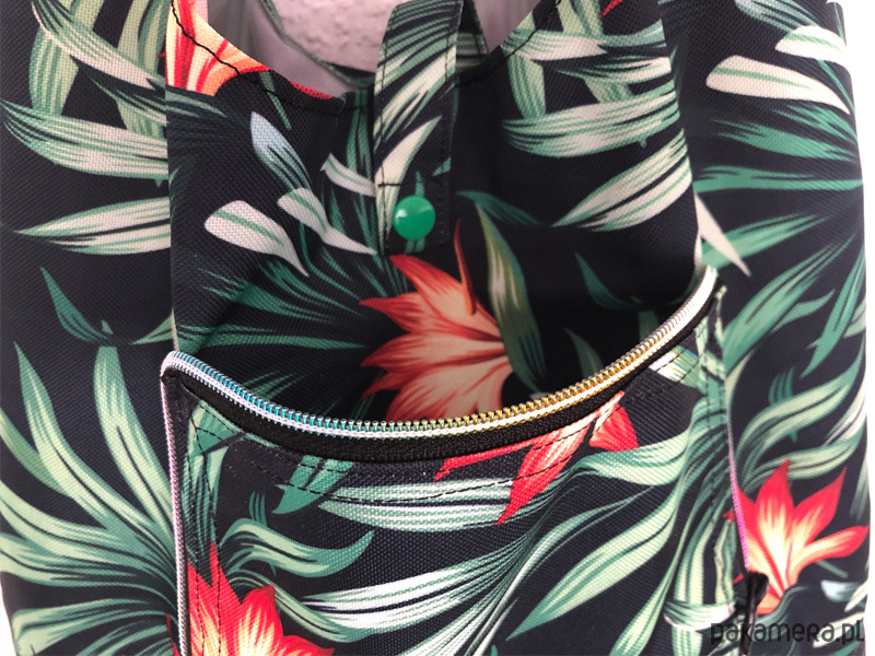 Po rozłożeniu torby, część z zamkiem tworzy zewnętrzną kieszeń 20cmx17cm.