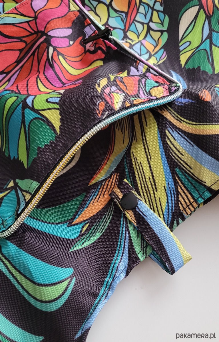 Po rozłożeniu torby, część z zamkiem tworzy zewnętrzną kieszeń 20cmx17cm.