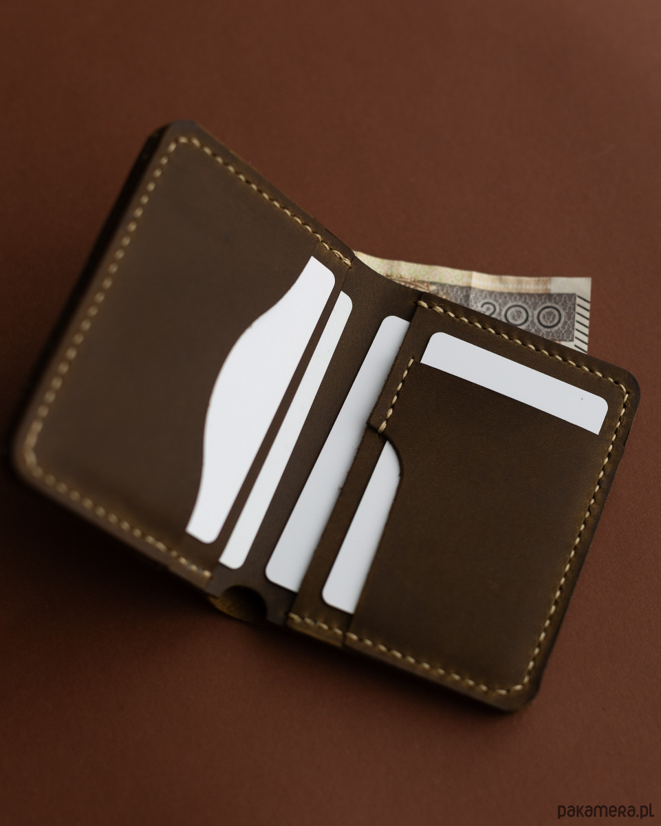 Wewnątrz znajduje się cztery kieszonki na karty lub dokumenty oraz przegroda na banknoty. Całość utrzymana jest w minimalistycznej, ponadczasowej formie, idealnej zarówno do codziennego użytku, jak i jako elegancki dodatek.