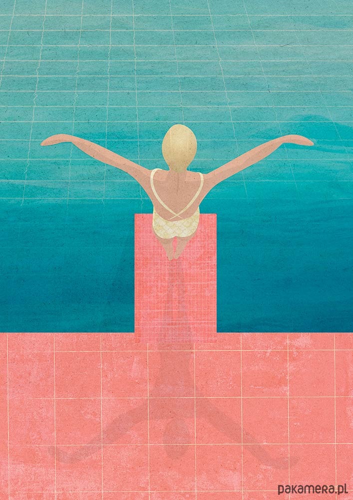 Plakat z autorską grafiką przedstawiający pływaczkę szykującą się do wykonania skoku do basenu. Grafika zaprojektowana przez pracownię Mayam posters.