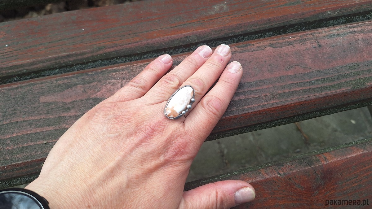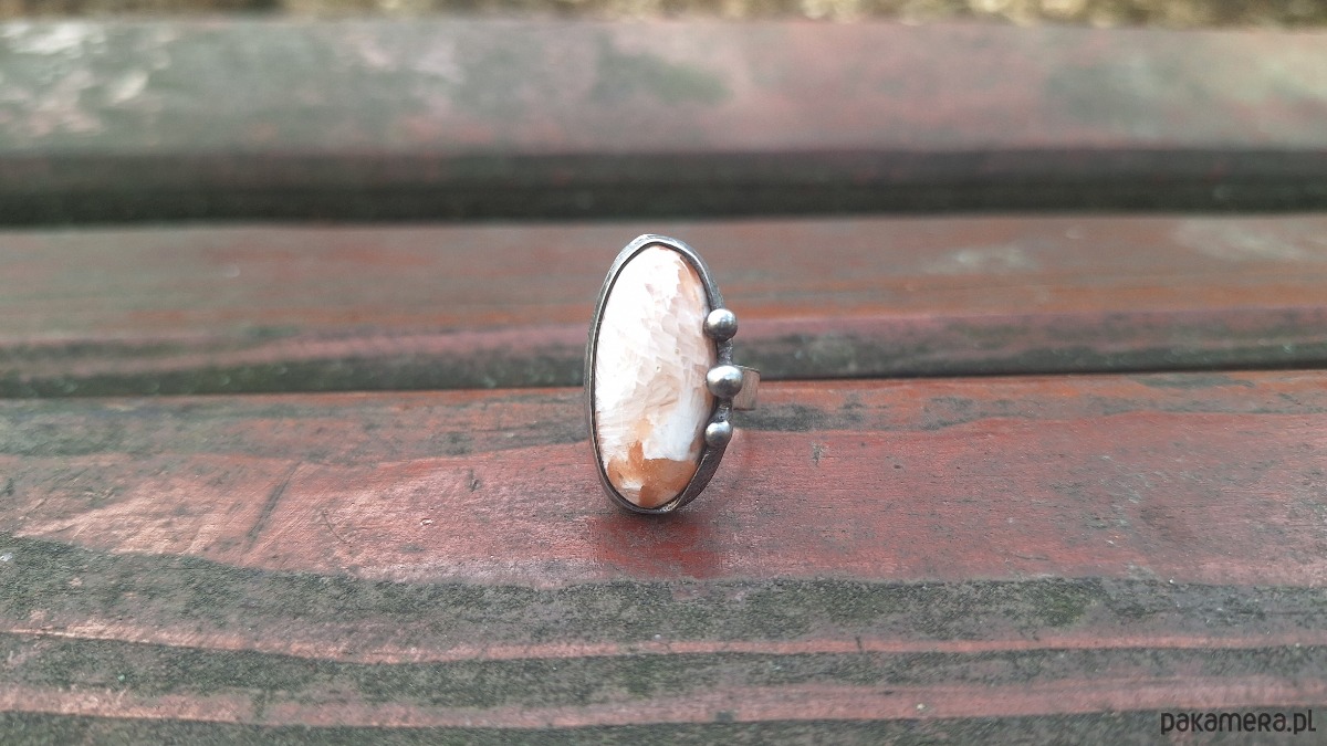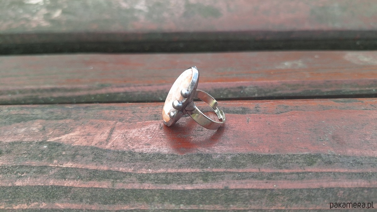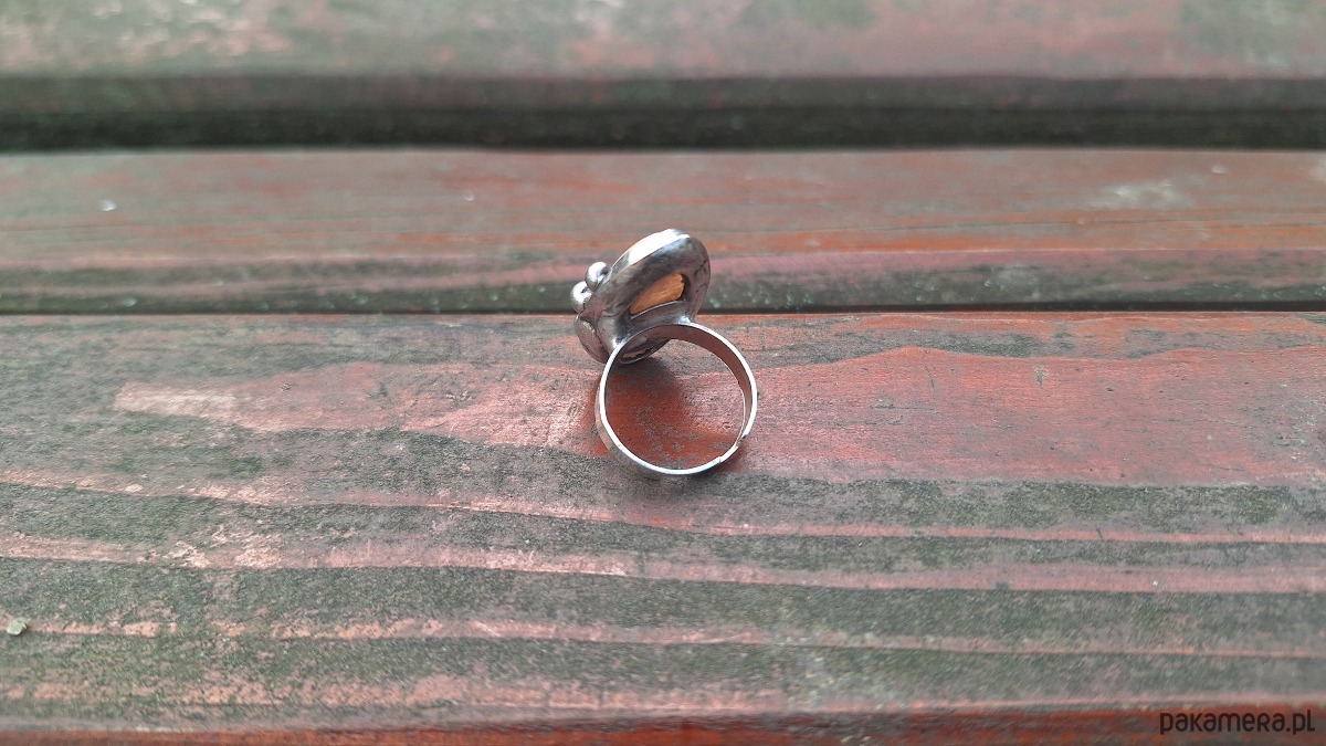 Pierścionek wykonany z miedzi, cyny i skolecytu. Wymiary ok. 2.8 na 1.5 cm. Regulowany. Nie jest ciężki.