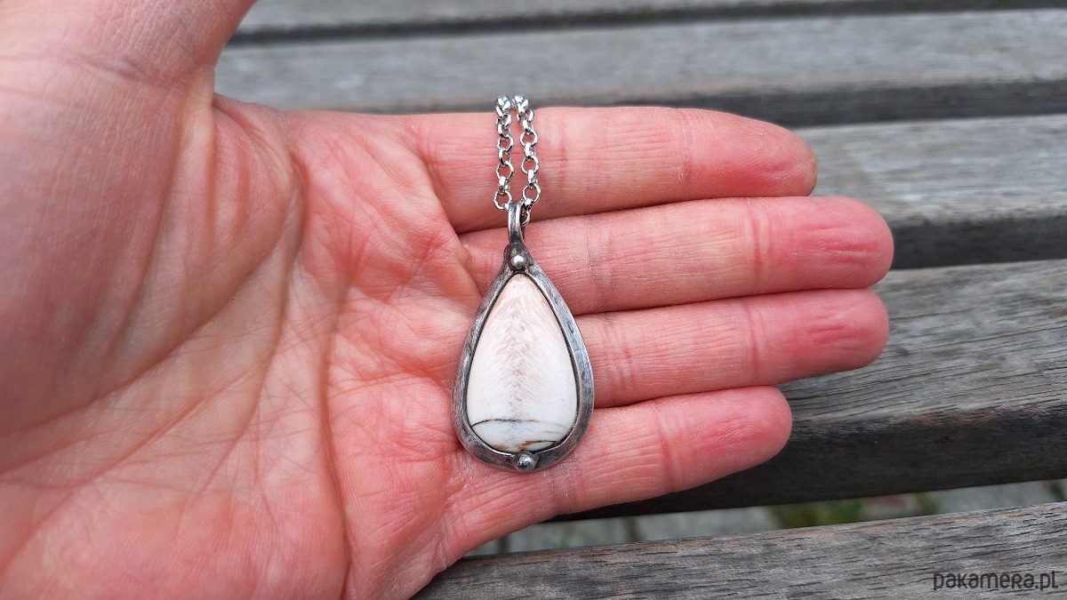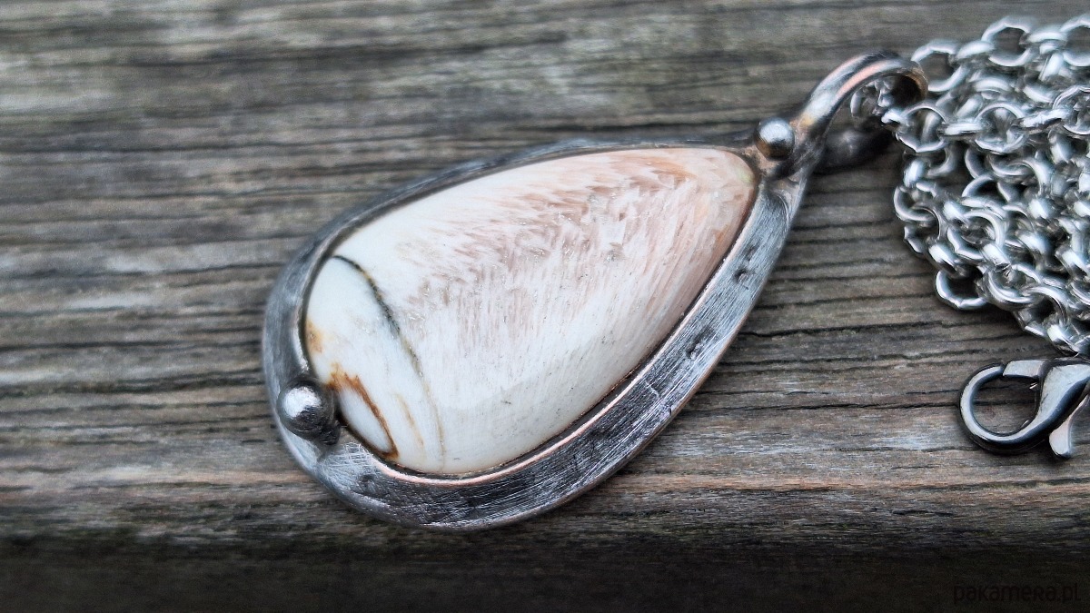Wisiorek wykonany z miedzi, cyny i skolecytu. Wymiary ok. 3.5 na 2 cm. Zawieszony na łańcuszku o długości ok. 50 cm.