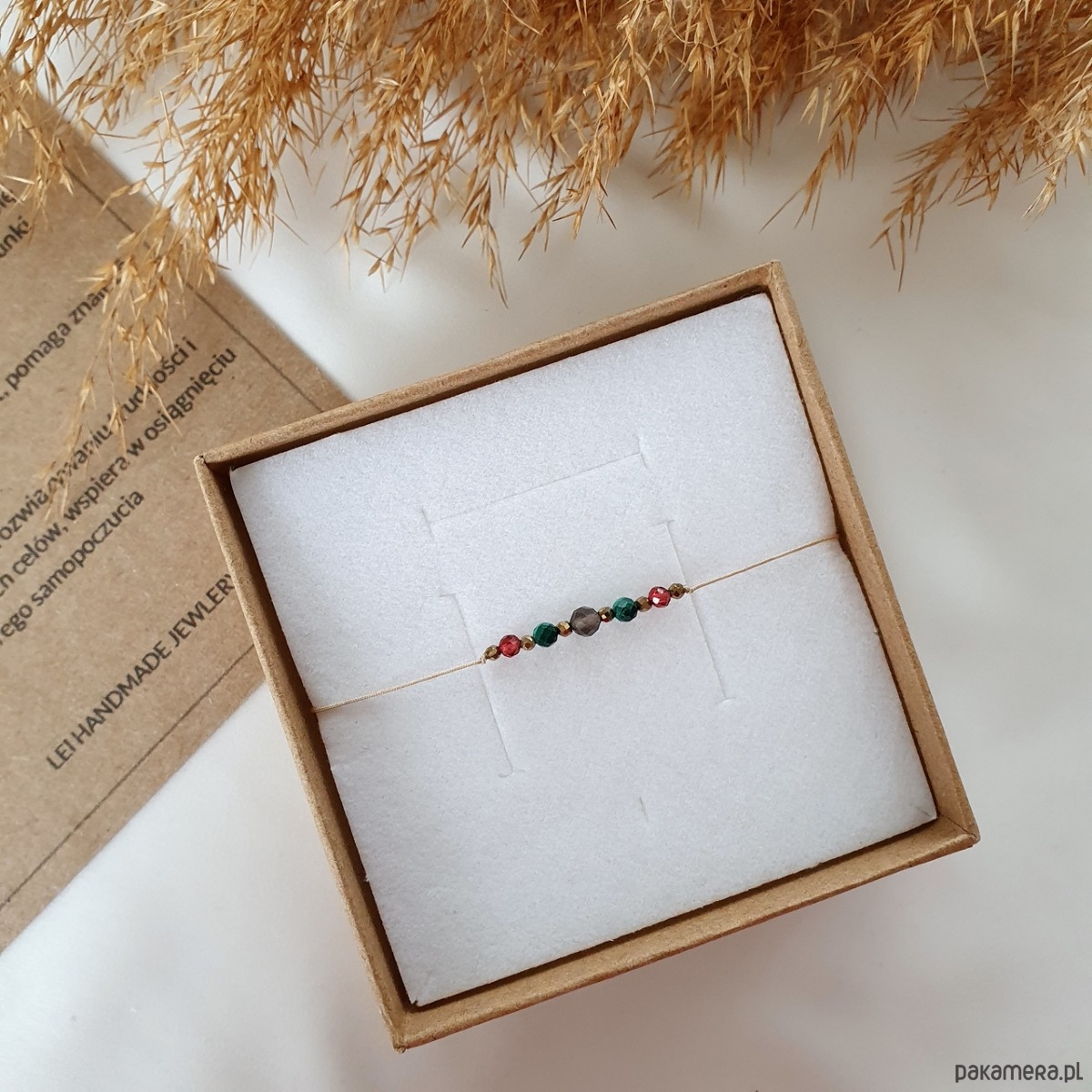 Całość pakowana w ozdobne pudełeczko, do którego dołączamy opis kamieni naturalnych wraz z ich właściwościami.