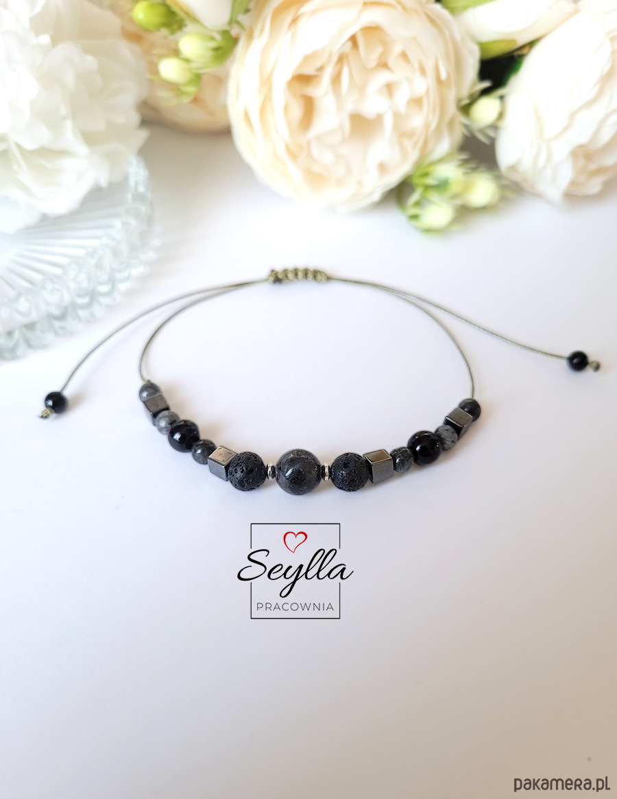 Męska bransoletka zrobiona z kamieni naturalnych: Labradorytu, Onyksu, Lawy oraz Hematytu.
