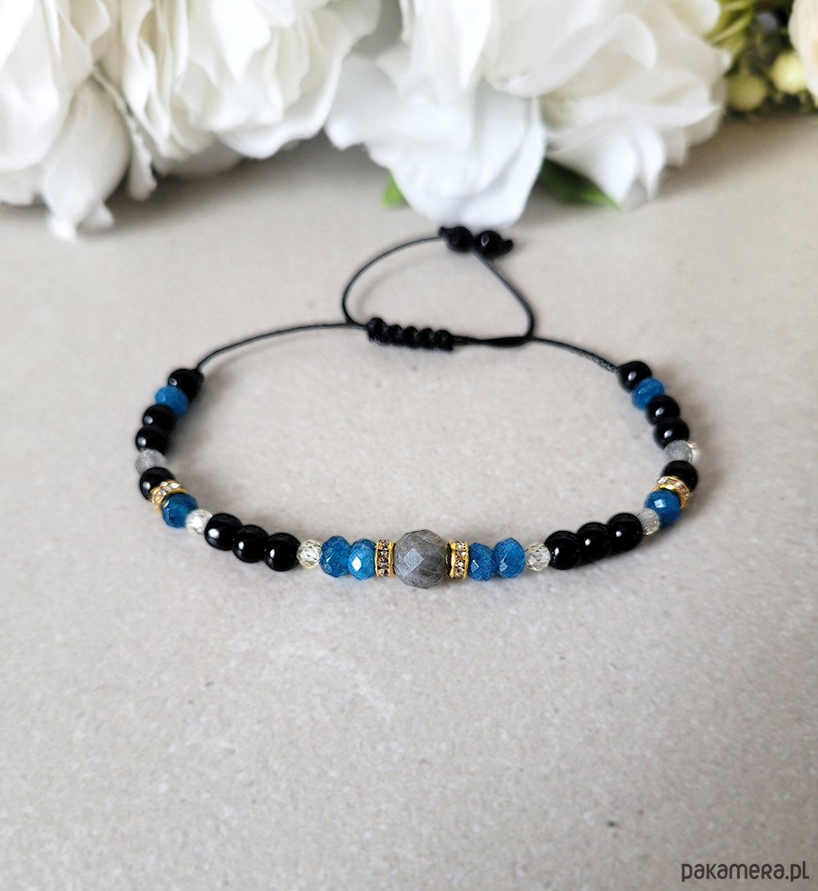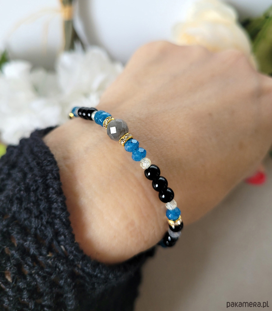 Damska bransoletka z kamieni naturalnych: Labradorytu, Agatu, Onyksu oraz z Cyrkonii głównie przeznaczona dla zodiakalnego Skorpiona.