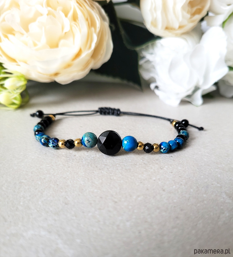 Przepiękna bransoletka zrobiona z kamieni naturalnych: Turmalinu, Onyksu, Jaspisu Cesarskiego oraz Hematytu w kolorze złota głównie przeznaczona dla zodiakalnego Skorpiona.