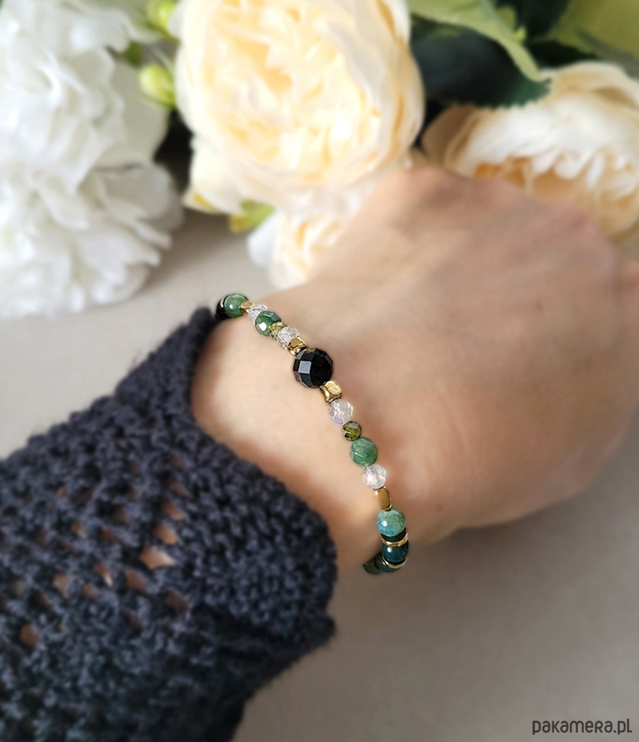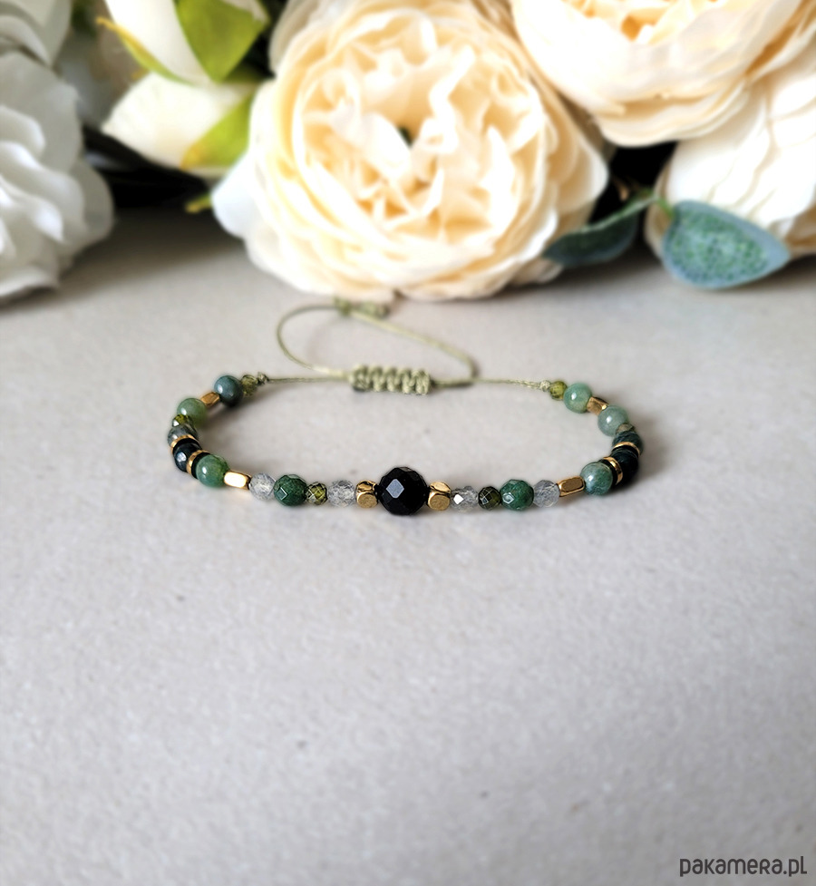 Bransoletka zrobiona z kamieni naturalnych: Labradorytu, Turmalinu, Agatu mszystego, Hematytu i Cyrkonii głównie przeznaczona dla zodiakalnego Skorpiona.