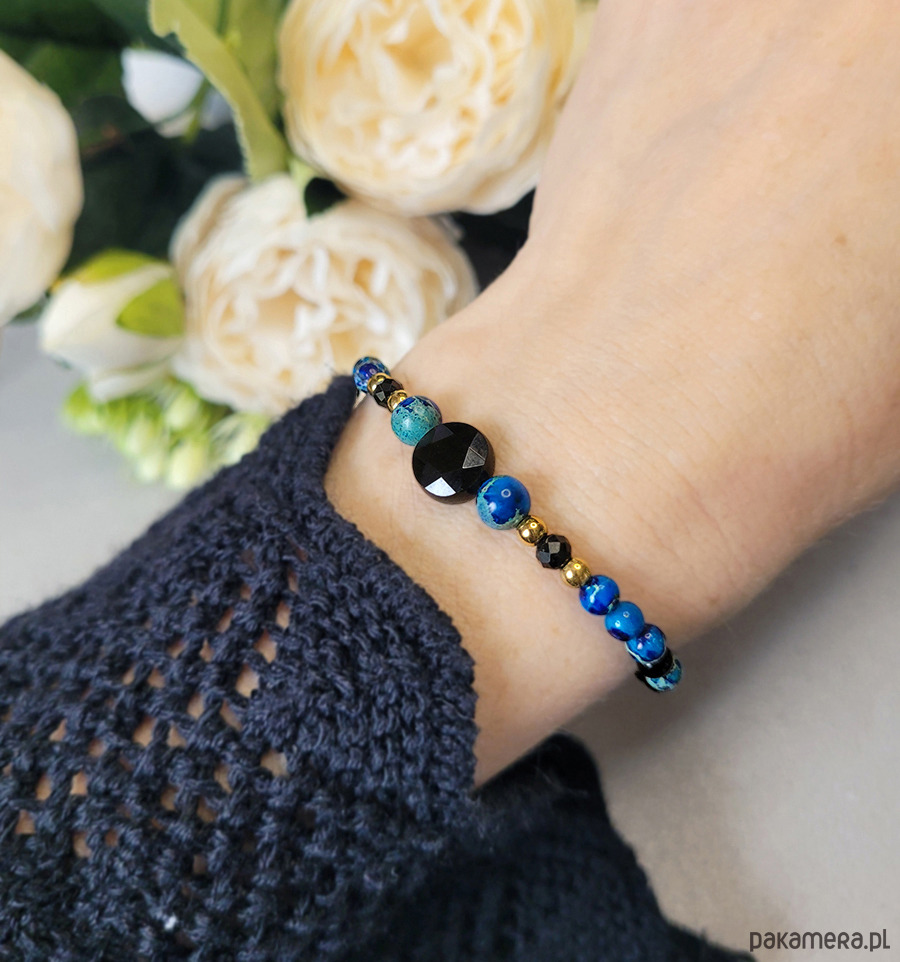 Przepiękna bransoletka zrobiona z kamieni naturalnych: Turmalinu, Obsydianu złocistego, Onyksu, Jaspisu Cesarskiego oraz Hematytu w kolorze złota głównie przeznaczona dla zodiakalnego Skorpiona.