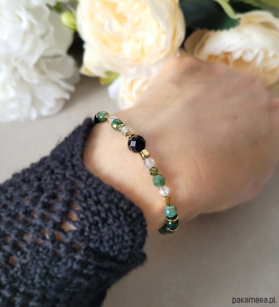 Bransoletka zrobiona z kamieni naturalnych: Labradorytu, Turmalinu, Agatu mszystego, Hematytu i Cyrkonii głównie przeznaczona dla zodiakalnego Skorpiona.