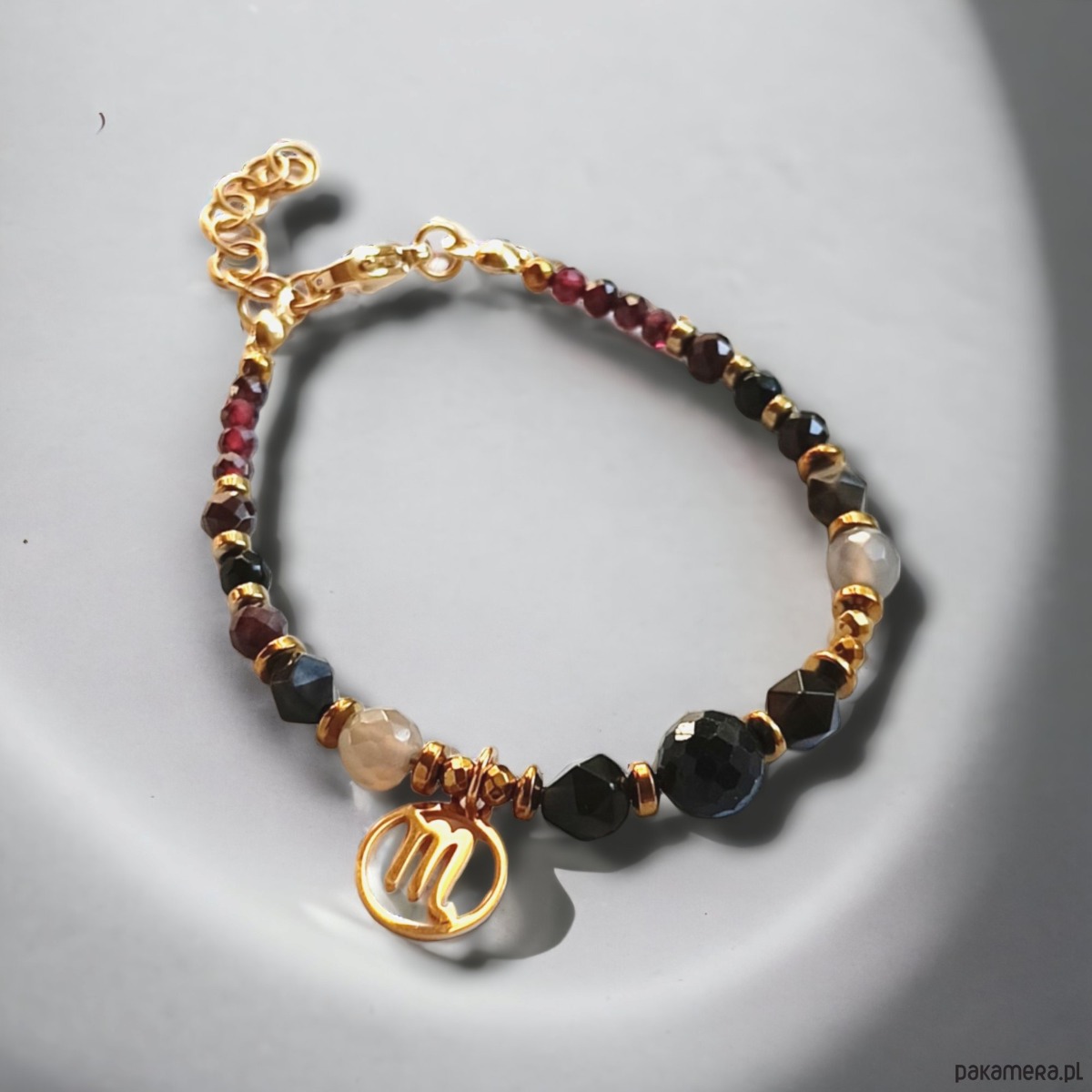 UŻYTE KAMIENIE (wielkość od 3 do 8,5mm) : czarny turmalin, obsydian złoty, agat szary, jaspis, granat, hematyt złoty.
