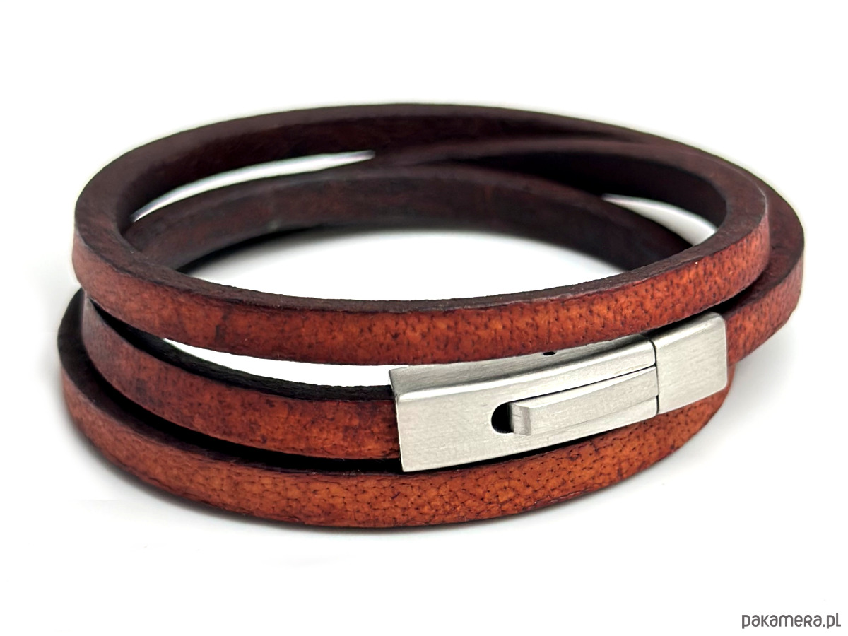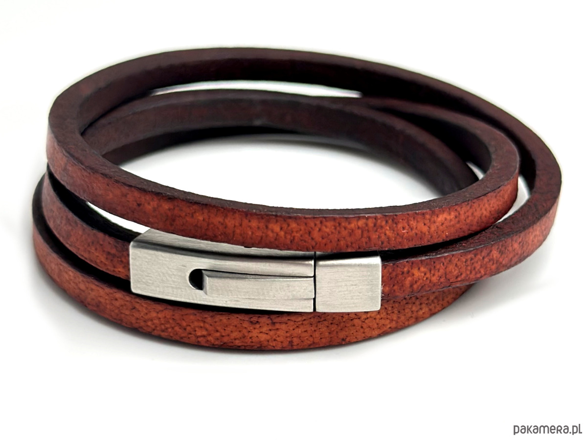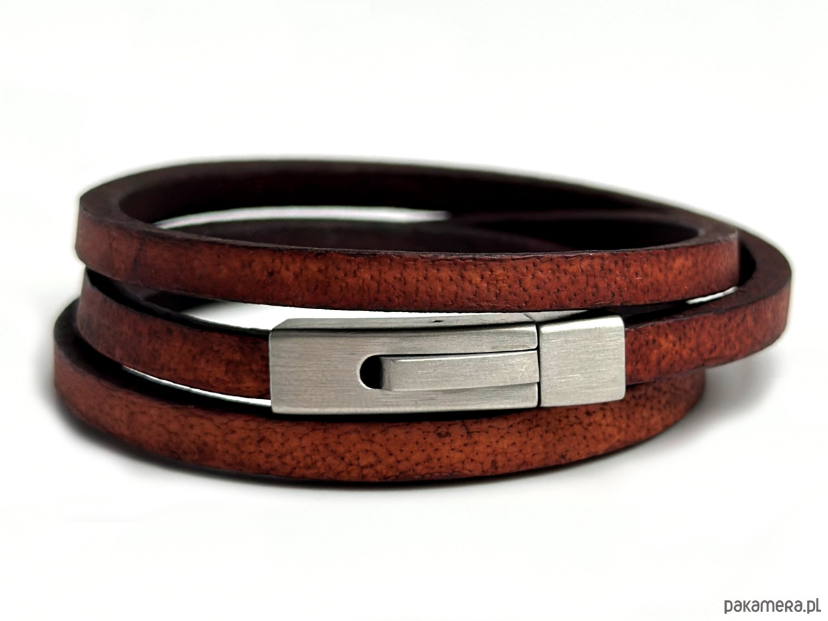 Skórzana bransoleta męska wykonana z grubego rzemienia gładkiego w kolorze brązowym. Rzemień ze skóry naturalnej garbowany roślinne.