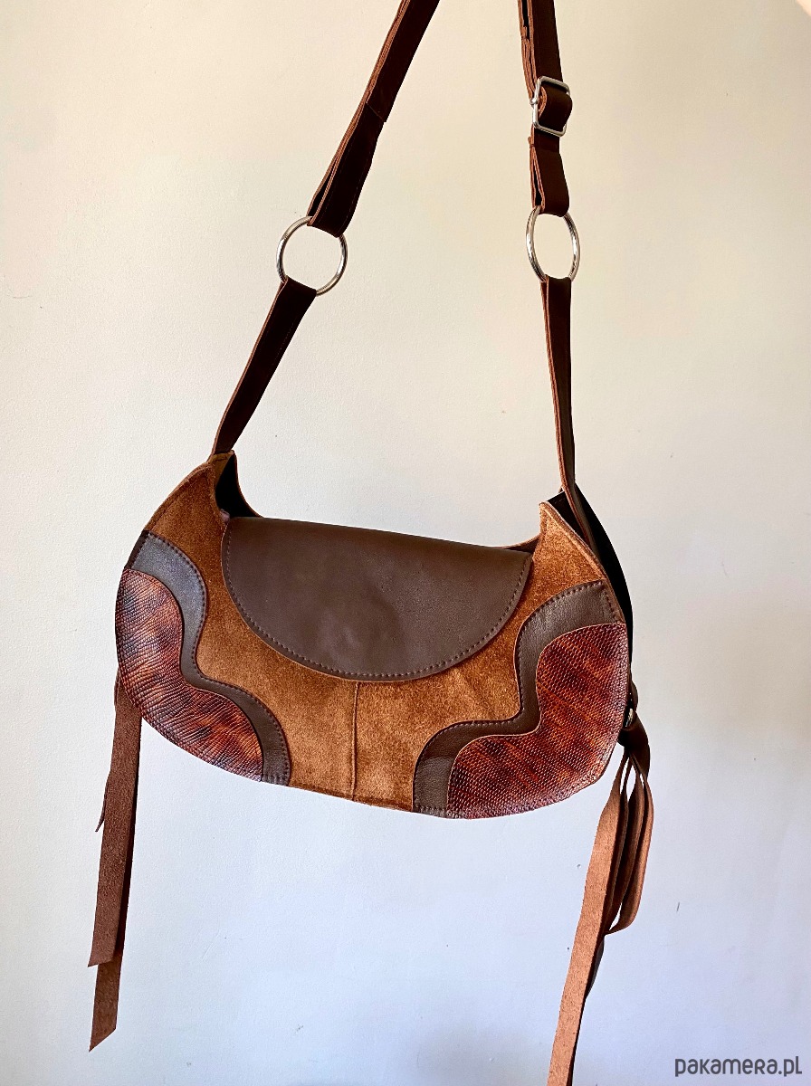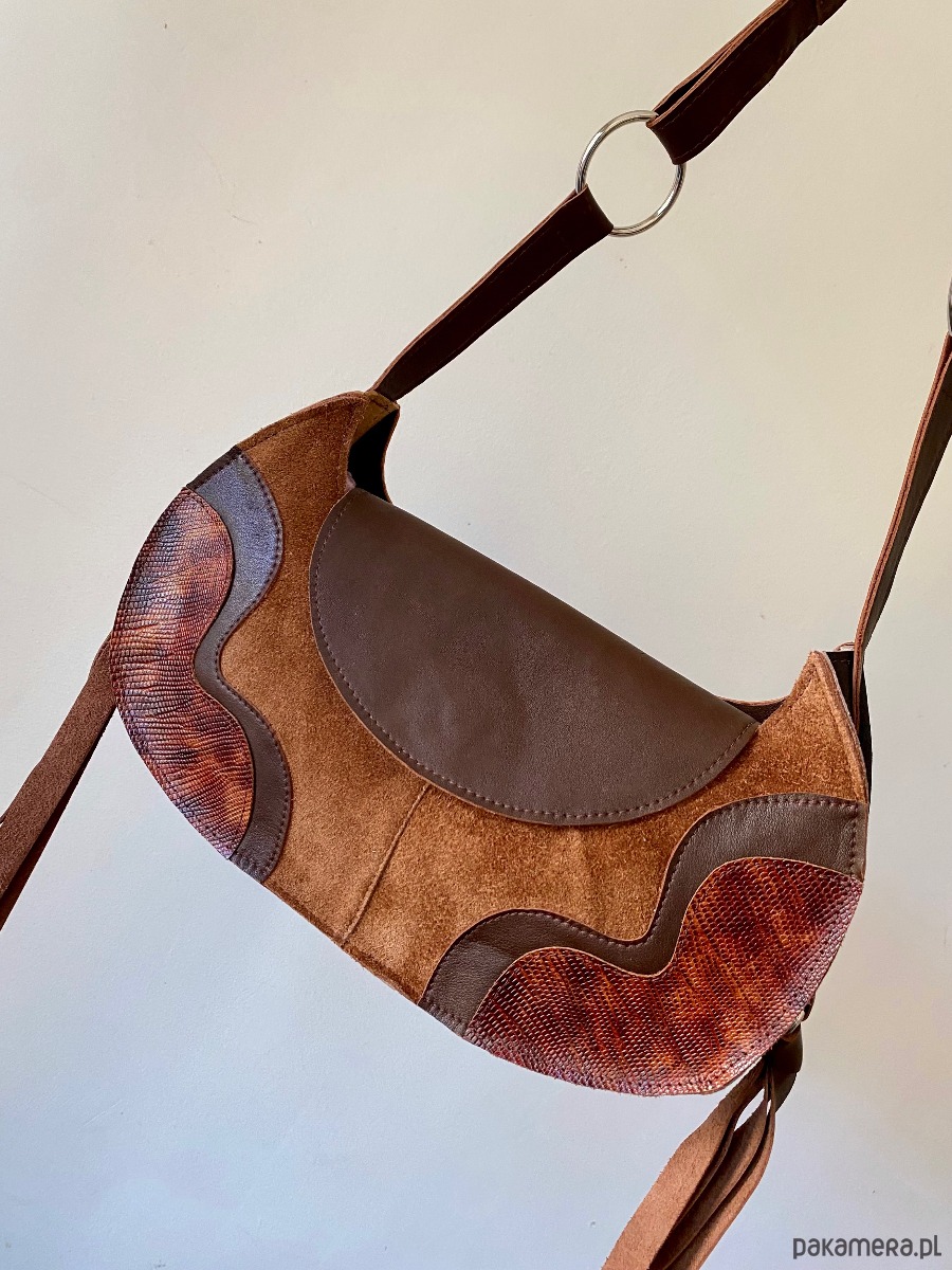 Torebka wykonana z różnych faktur i kolorów ścinek skóry naturalnej i zamszu z drugiego obiegu w kolorze. Torba zapinana jest na magnes. Pasek jest regulowany, dzięki czemu można ją nosić przez głowę. Ten model jest idealny na najpotrzebniejsze rzeczy- portfel, telefon, klucze i np ładowarkę na telefon. Wewnątrz torebki znajduje się dodatkowa kieszonka.