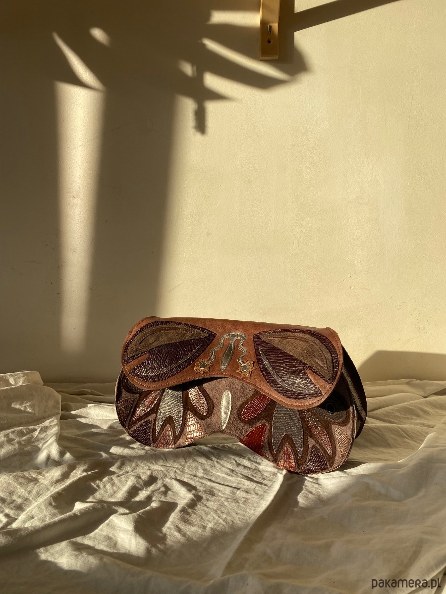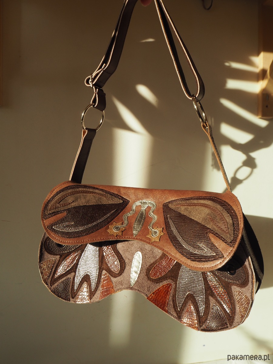 Torebka motyl wykonany jest z brązowych ścinek skóry naturalnej i zamszu, niepowtarzalna i oryginalna. Torba zapinana jest na magnes. Pasek jest regulowany, dzięki czemu można ją nosić przez głowę. Ten model jest idealny na najpotrzebniejsze rzeczy- portfel, telefon, klucze i np ładowarkę na telefon, ale zmieści się też np mniejszy aparat fotograficzny czy kosmetyczka. Wewnątrz torebki znajduje się dodatkowa kieszonka.