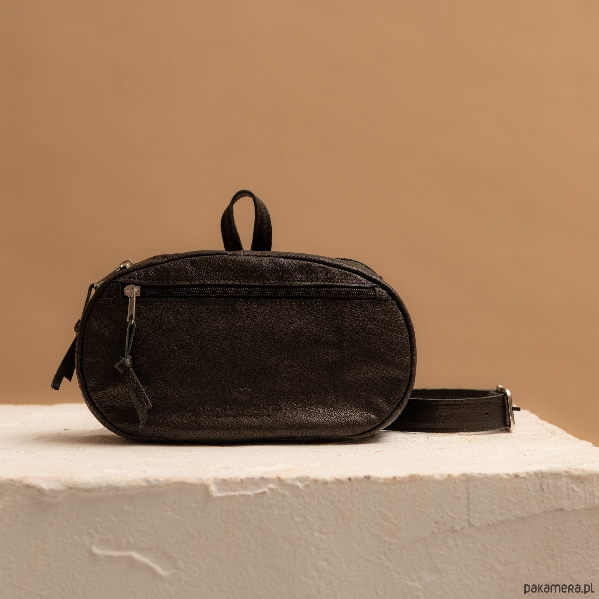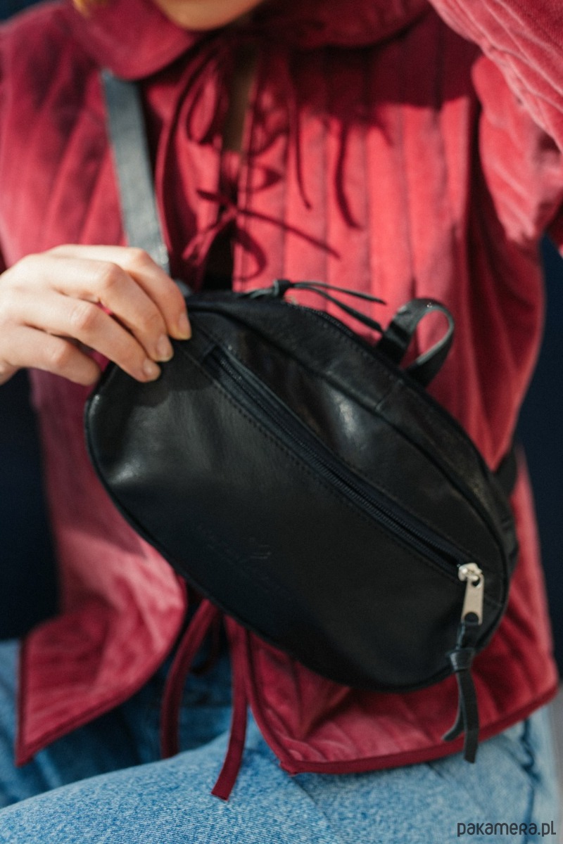 Klasyczna skórzana torebka nerka ze skóry. Okrągła bryła w uniwersalnym czarnym kolorze. Wykonana z wytrzymałej skóry licowej. Nerka z wygodnym, regulowanym za pomocą klamerki paskiem - dzięki czemu można ją nosić wokół bioder i przewieszoną przez ramię. Kieszonki na suwak umieszczone wewnątrz i z tyłu nerki (kieszonka bezpieczeństwa) zwiększają komfort użytkowania i zapewnią Ci gwarancję, że masz wszystko co może się przydać, a każda rzecz ma swoje miejsce. Funkcjonalny uchwyt, dzięki któremu możesz wygodnie chwycić ją w palce lub odwiesić na wieszak - dodaje jej charakteru.