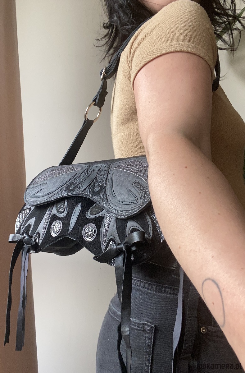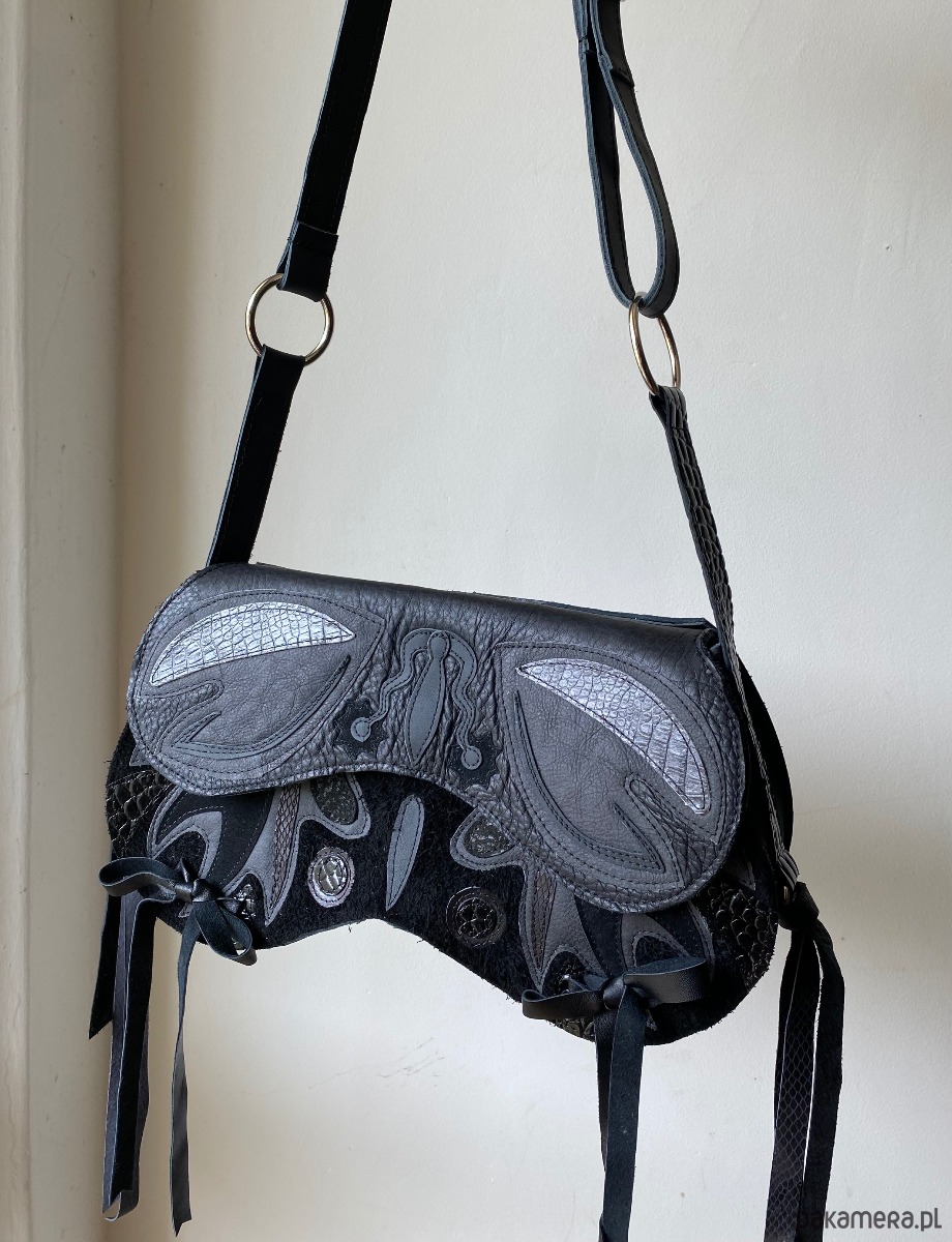 Torebka motyl wykonana z różnych faktur czarnej skóry naturalnej. Po bokach są paseczki a na przodzie kokardki. Torba zapinana jest na magnes. Pasek jest regulowany, dzięki czemu można ją nosić przez głowę. Ten model jest idealny na najpotrzebniejsze rzeczy- portfel, telefon, klucze i np ładowarkę na telefon, ale zmieści się też np mniejszy aparat fotograficzny czy kosmetyczka. Wewnątrz torebki znajduje się dodatkowa kieszonka.