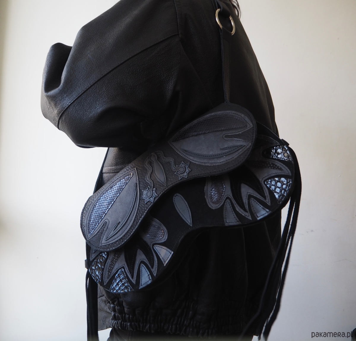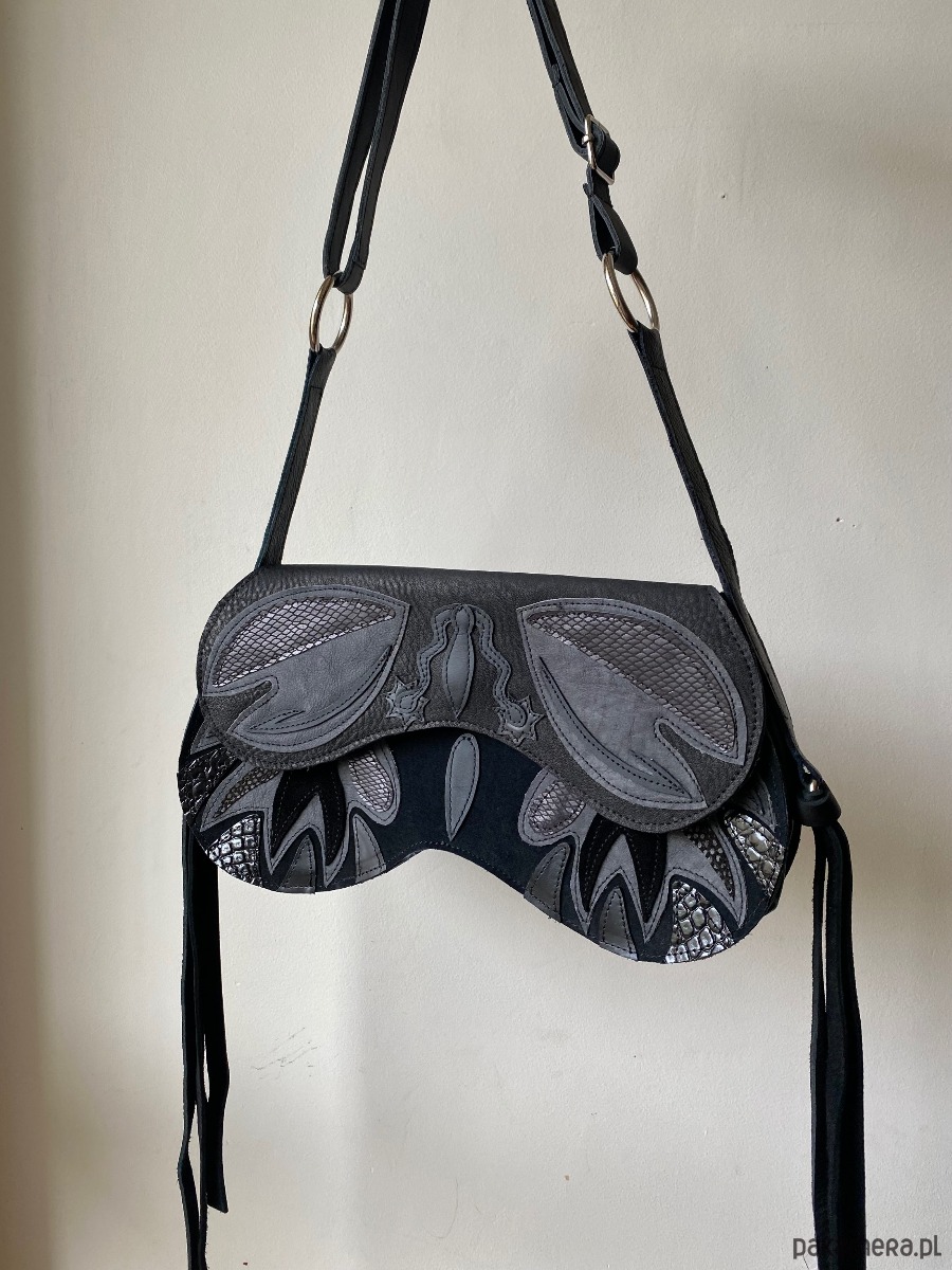 Torebka motyl wykonana z różnych faktur czarnej skóry naturalnej. Po bokach są paseczki a na przodzie kokardki. Torba zapinana jest na magnes. Pasek jest regulowany, dzięki czemu można ją nosić przez głowę. Ten model jest idealny na najpotrzebniejsze rzeczy- portfel, telefon, klucze i np ładowarkę na telefon, ale zmieści się też np mniejszy aparat fotograficzny czy kosmetyczka. Wewnątrz torebki znajduje się dodatkowa kieszonka.