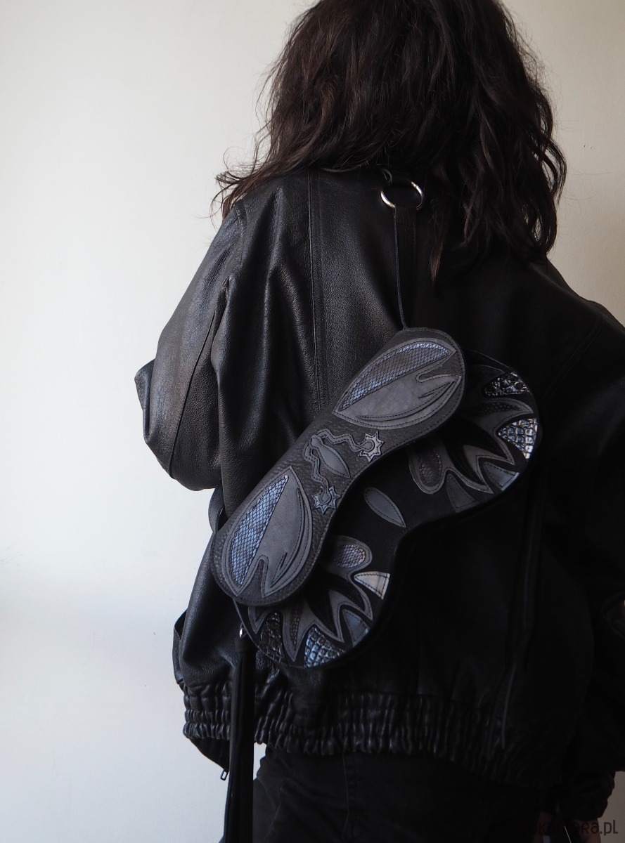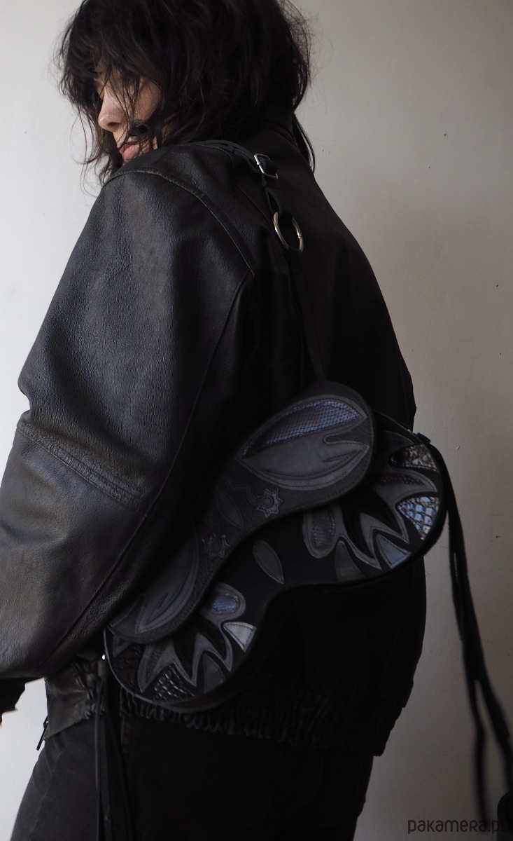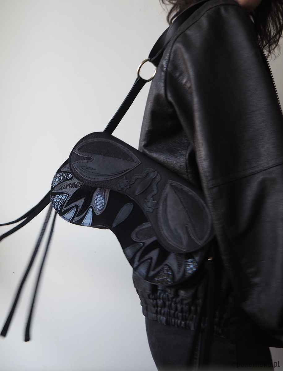 Skórzana czarna torebka motyl z kokardkami ćma z upcyklingu