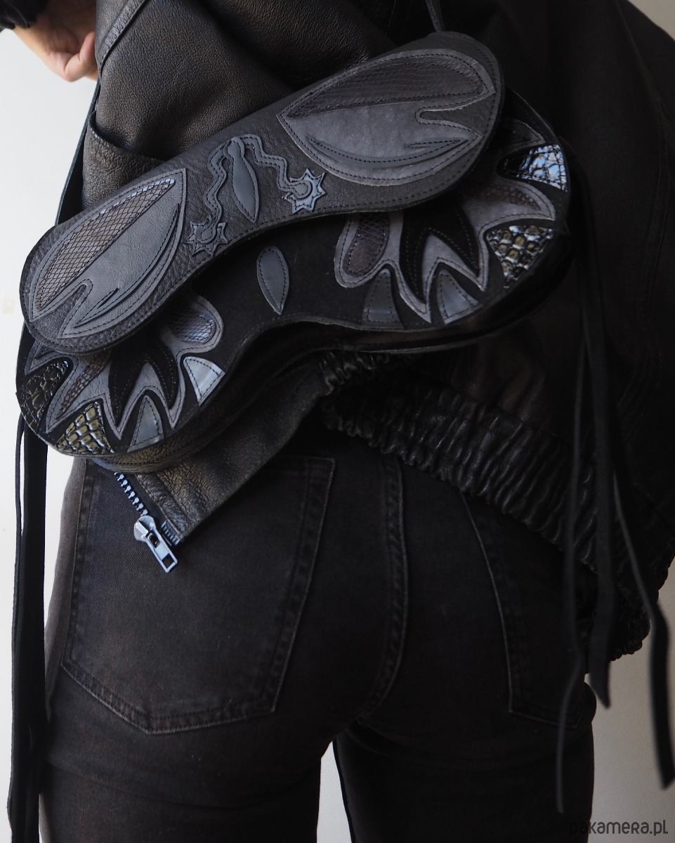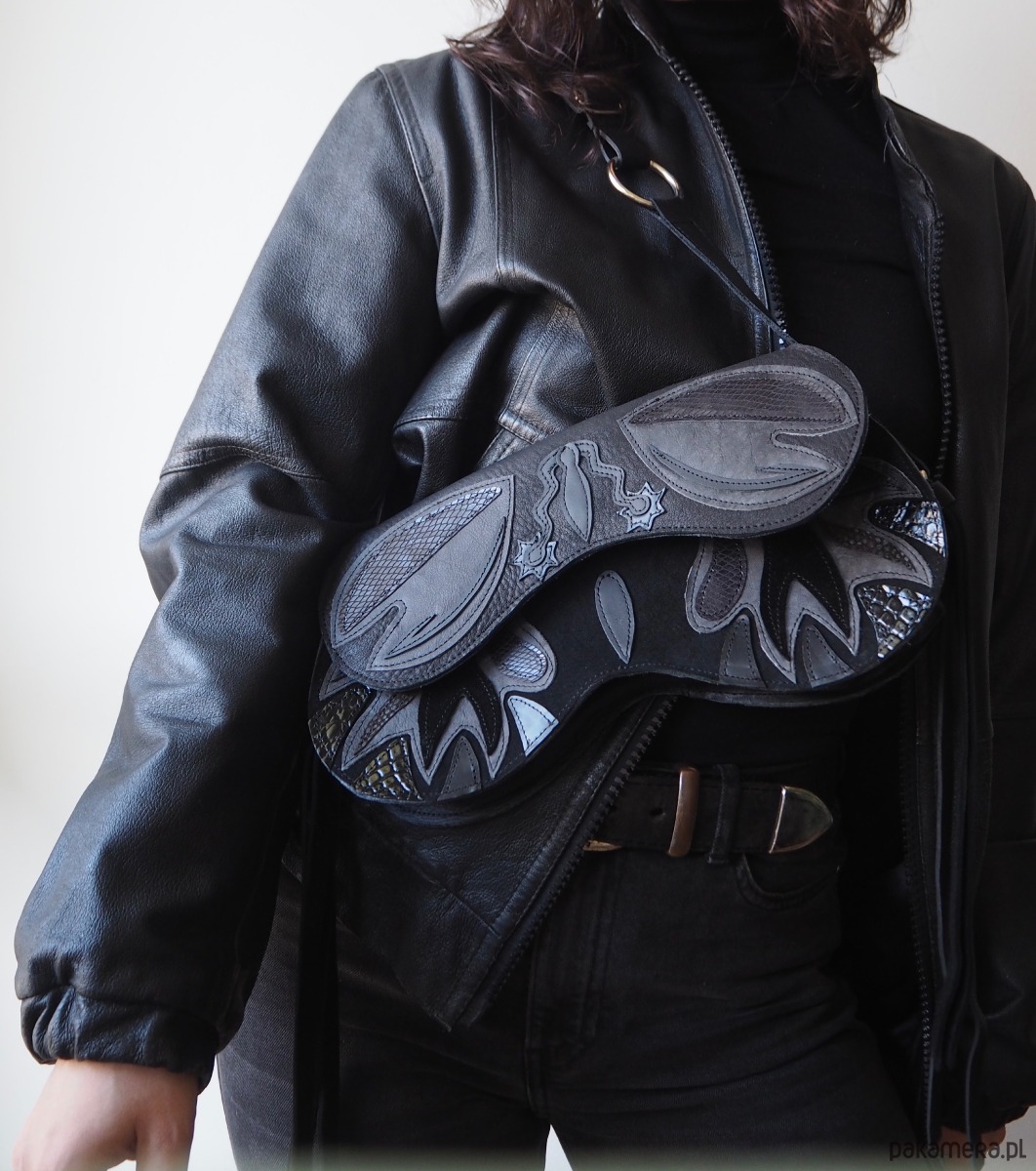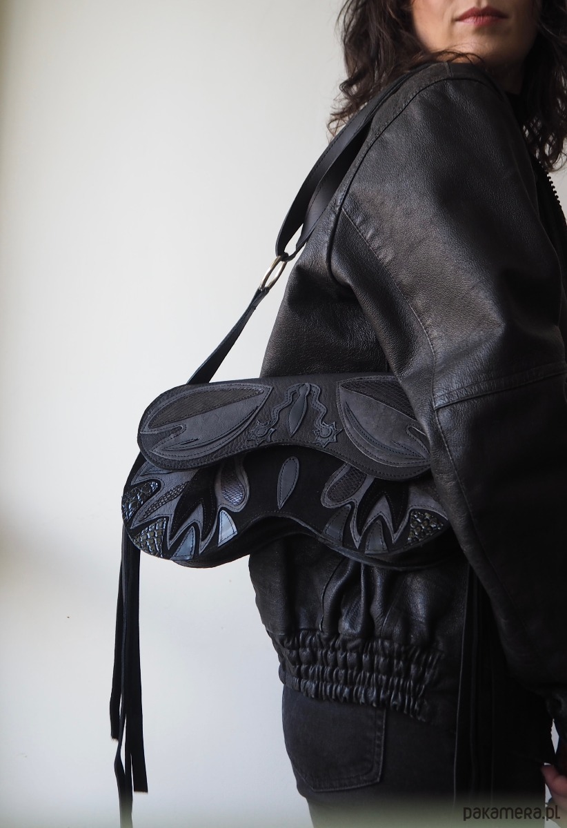 Skórzana czarna torebka motyl z kokardkami ćma z upcyklingu