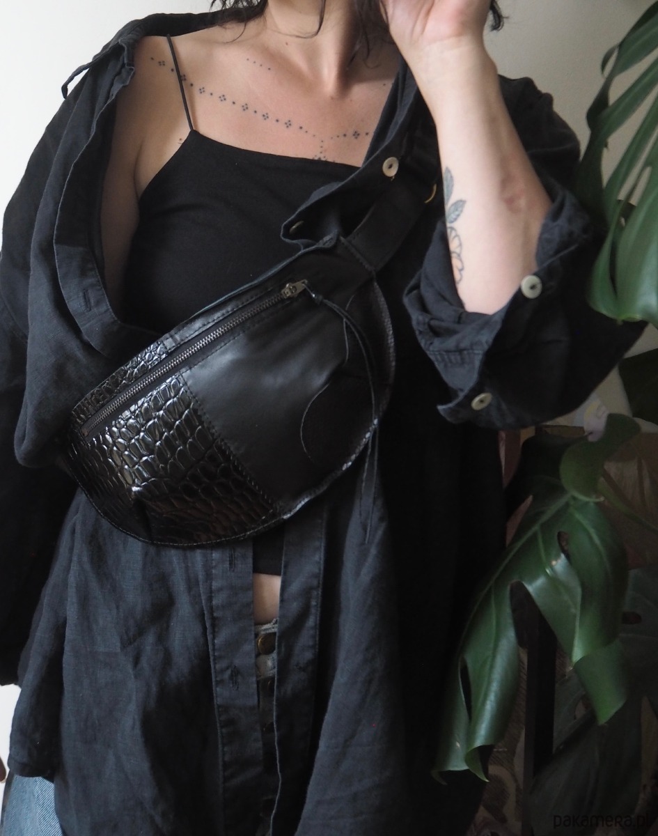 Nerka wykonany jest ze ścinek skóry naturalnej, pasek jest ze skóry naturalnej i jest to vintage zdobycz. Na torebce i pasku tłoczony wzór zwierzęcy. Nerka jest oryginalna, wykonana w jednym egzemplarzu. Nerka zapinana jest na zamek, w środku jest dodatkowa kieszonka np na karty czy telefon. Pasek jest regulowany, dzięki czemu można ją nosić przez głowę. Ten model jest idealny na najpotrzebniejsze rzeczy- portfel, telefon, klucze i np ładowarkę na telefon.