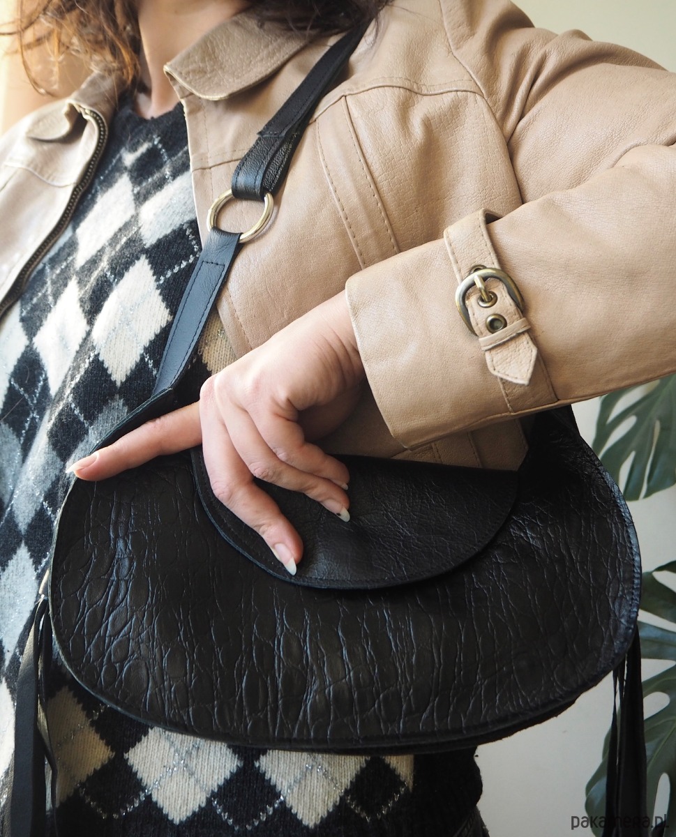 Torebka wykonana z czarnej skóry naturalnej z drugiego obiegu. Torba zapinana jest na magnes. Pasek jest regulowany, dzięki czemu można ją nosić przez głowę. Ten model jest idealny na najpotrzebniejsze rzeczy- portfel, telefon, klucze i np ładowarkę na telefon. Wewnątrz torebki znajduje się dodatkowa kieszonka.