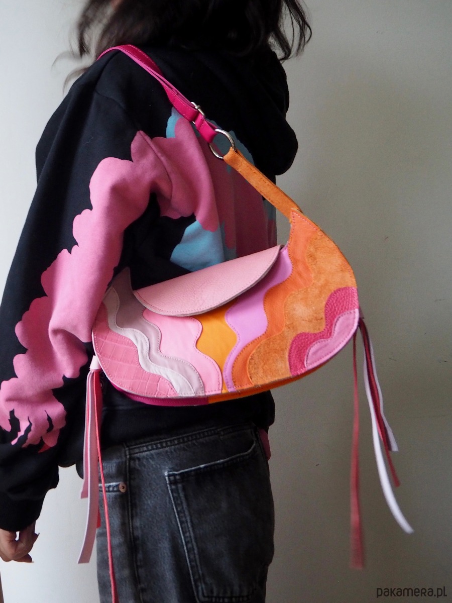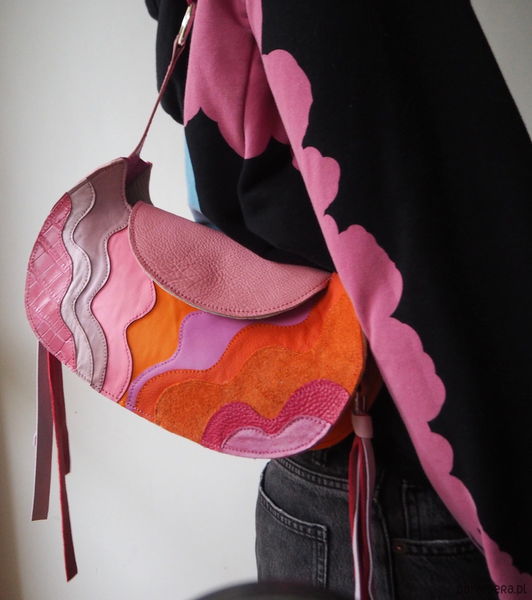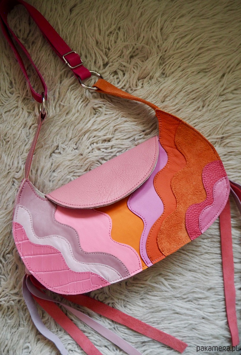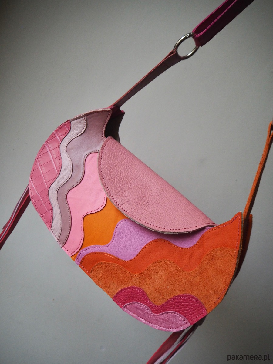Torebka wykonana z różnych faktur różowej i pomarańczowej skóry naturalnej i zamszu. Torba zapinana jest na magnes. Pasek jest regulowany, dzięki czemu można ją nosić przez głowę. Ten model jest idealny na najpotrzebniejsze rzeczy- portfel, telefon, klucze i np ładowarkę na telefon. Wewnątrz torebki znajduje się dodatkowa kieszonka.