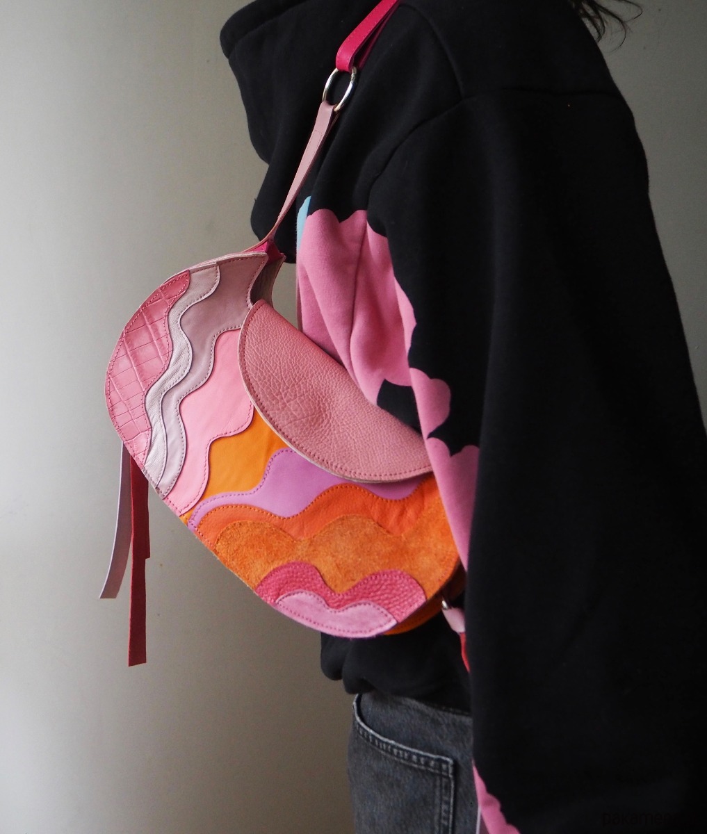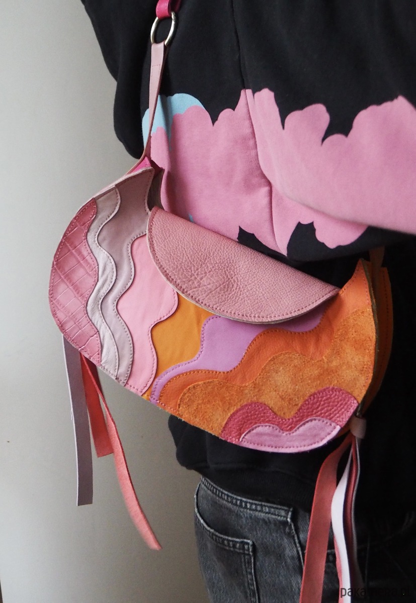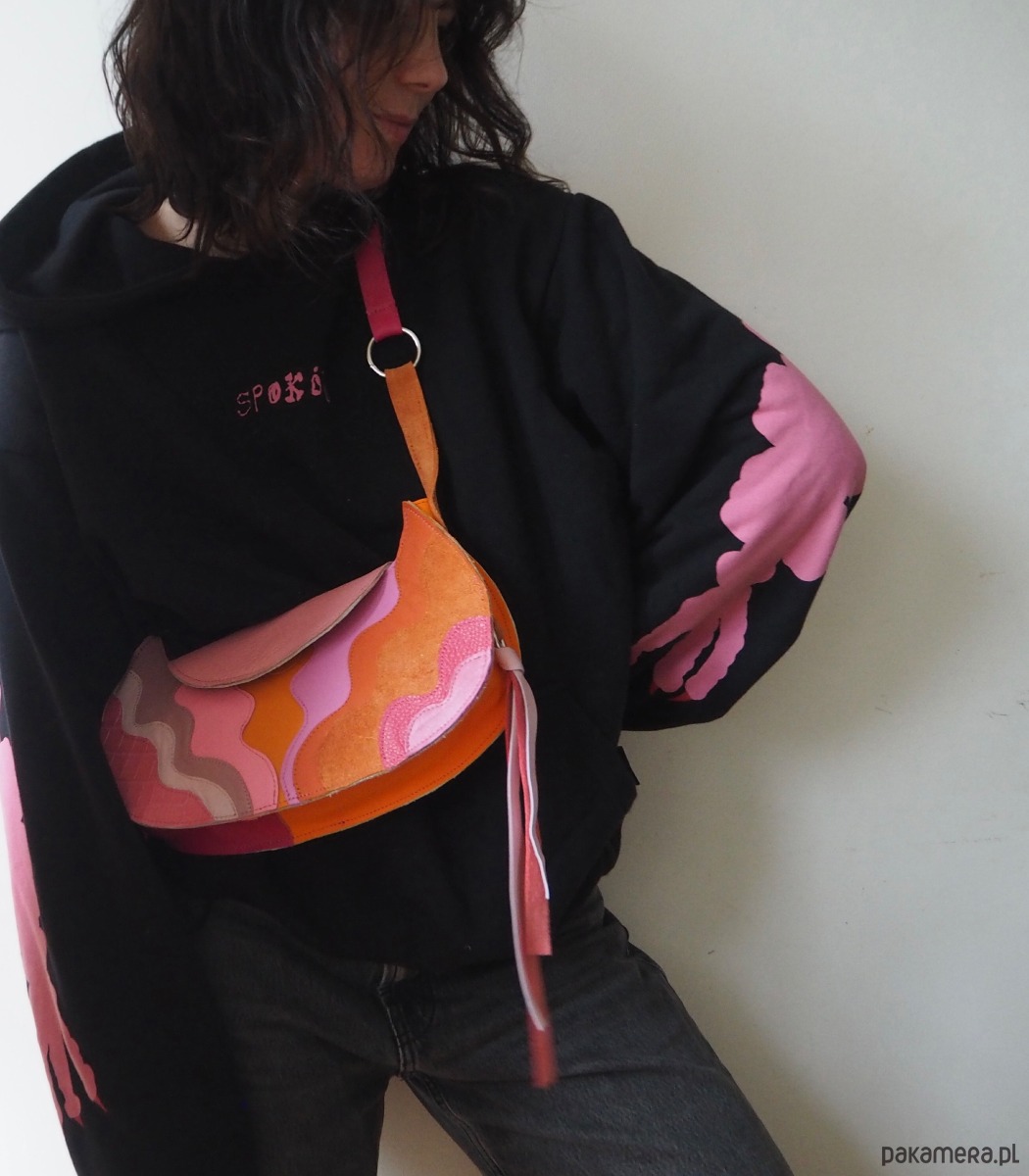 Torebka wykonana z różnych faktur różowej i pomarańczowej skóry naturalnej i zamszu. Torba zapinana jest na magnes. Pasek jest regulowany, dzięki czemu można ją nosić przez głowę. Ten model jest idealny na najpotrzebniejsze rzeczy- portfel, telefon, klucze i np ładowarkę na telefon. Wewnątrz torebki znajduje się dodatkowa kieszonka.