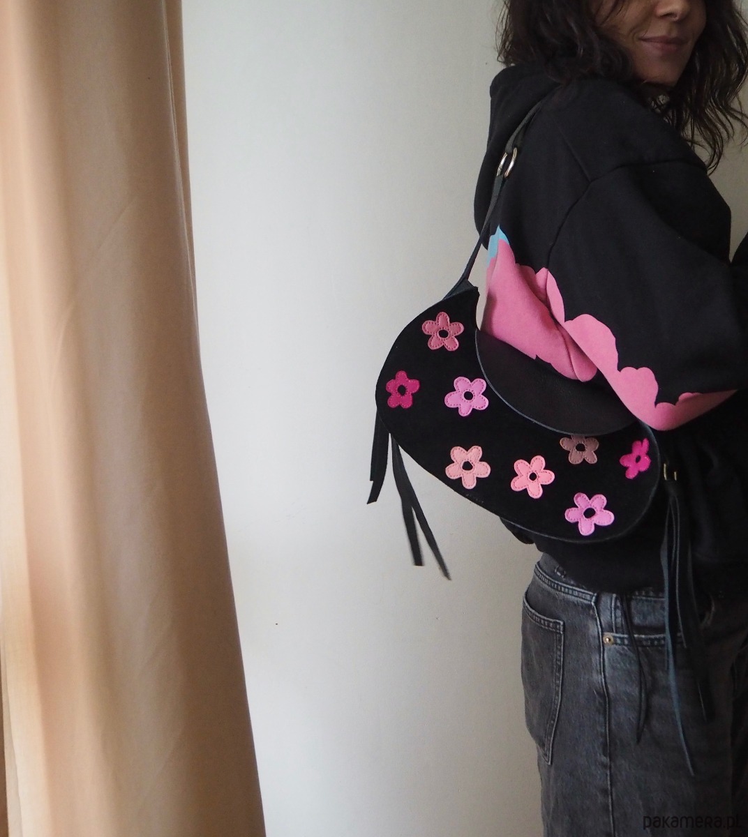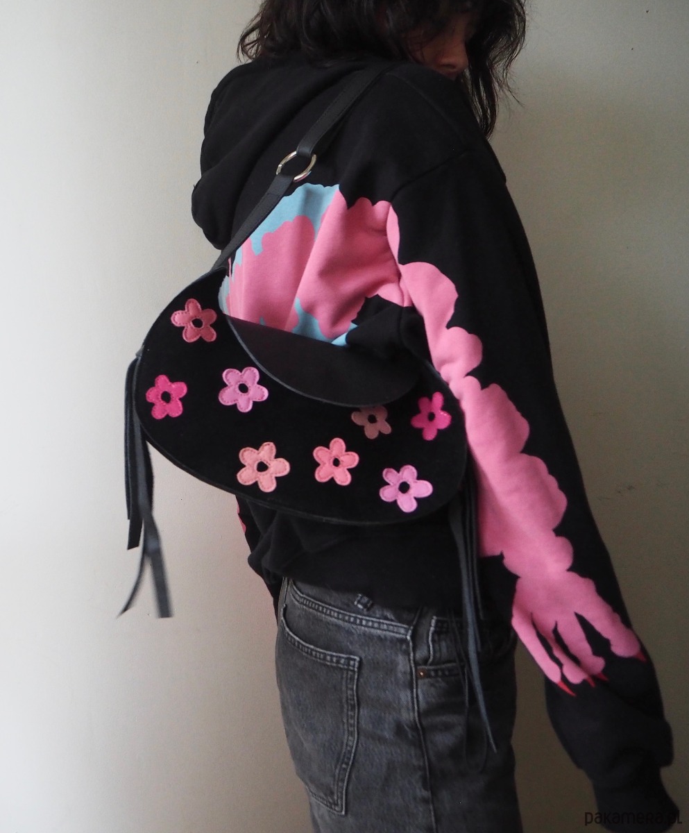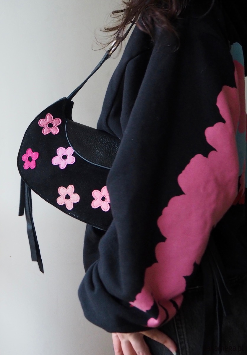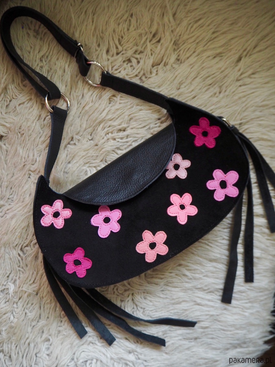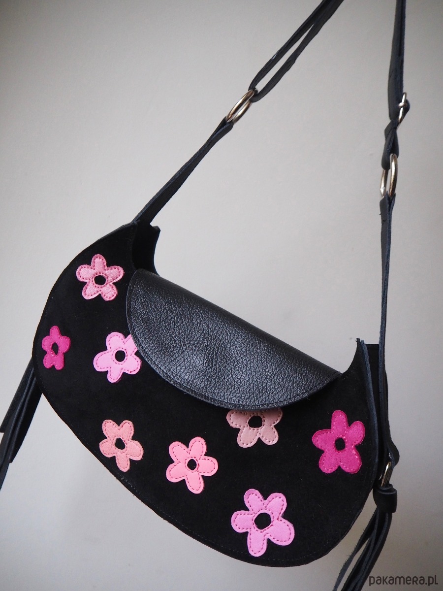 Torebka wykonana z różnych faktur czarnej skóry naturalnej i zamszu w różowe kwiatki. Torba zapinana jest na magnes. Pasek jest regulowany, dzięki czemu można ją nosić przez głowę. Ten model jest idealny na najpotrzebniejsze rzeczy- portfel, telefon, klucze i np ładowarkę na telefon. Wewnątrz torebki znajduje się dodatkowa kieszonka.