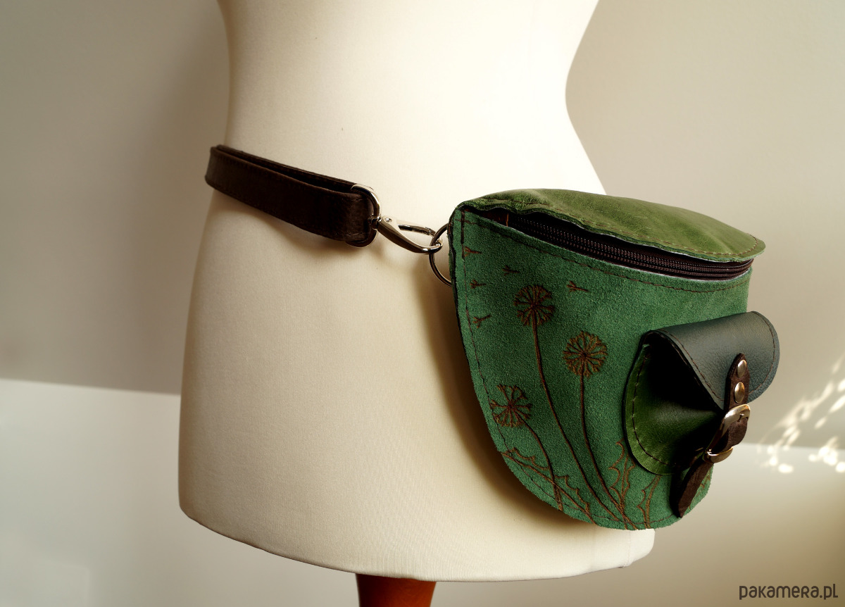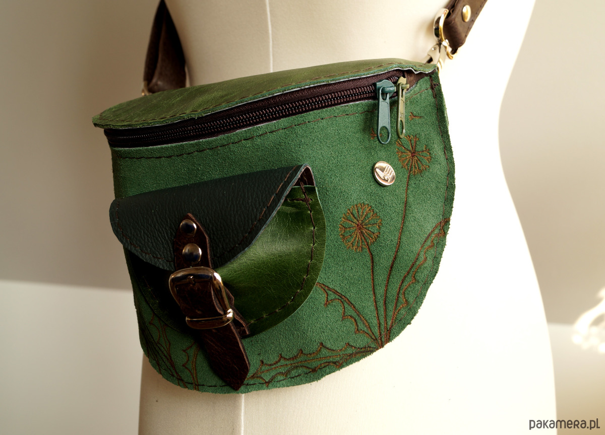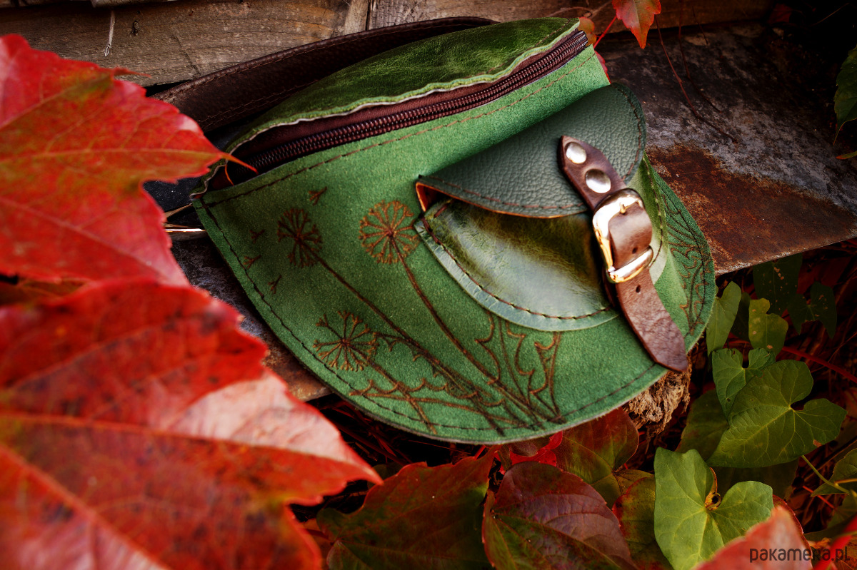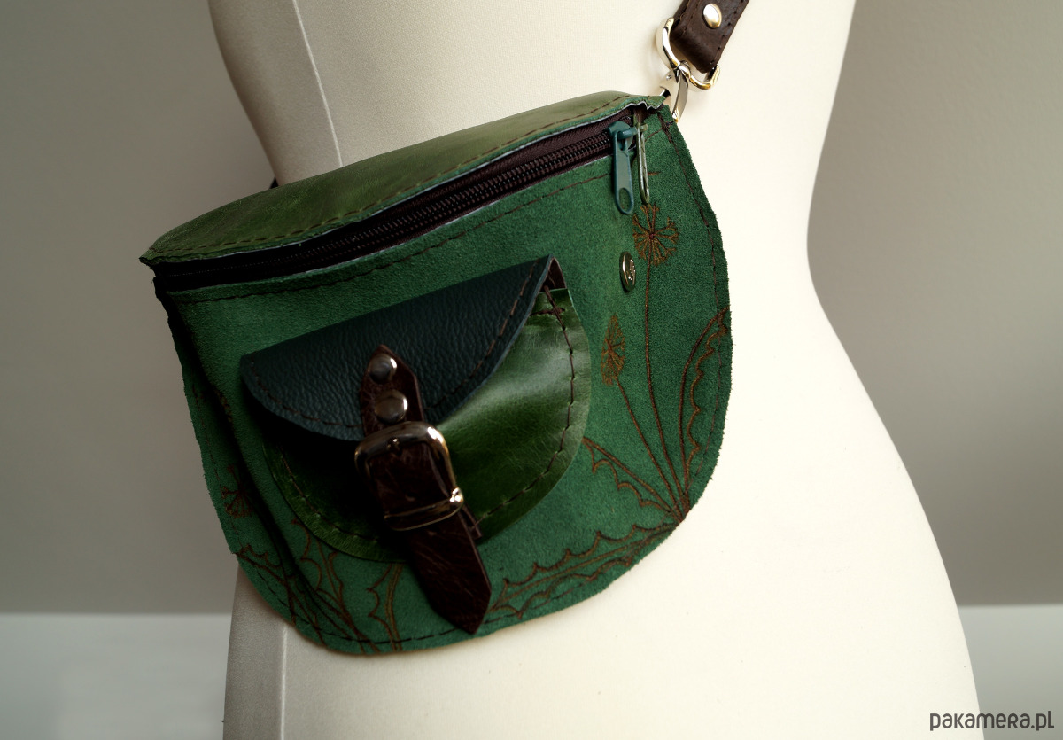 Praktyczna torebka na pas uszyta z zielonych skór naturalnych o różnych odcieniach i fakturach. Ręcznie wypalony motyw polnych kwiatów. Niewielka ale pojemna, pomieści telefon, portfel, chusteczki i najpotrzebniejsze kosmetyki. Z tyłu jedna, a z przodu dwie niewielkie kieszenie. Wewnątrz przegródka. Sprzedawana w komplecie z regulowanym paskiem zapinanym na karabińczyki. Można ją nosić również na ramieniu. Wymiary: 21/17cm.