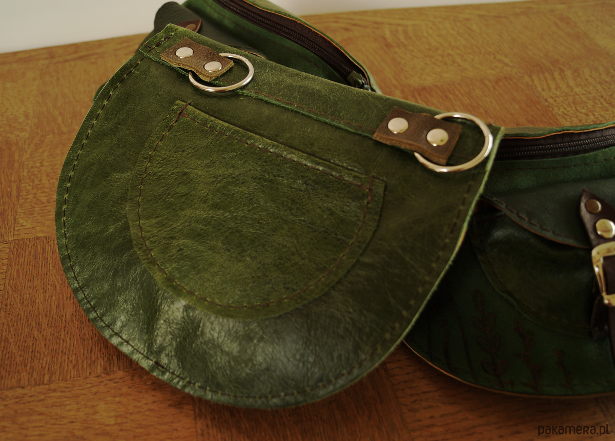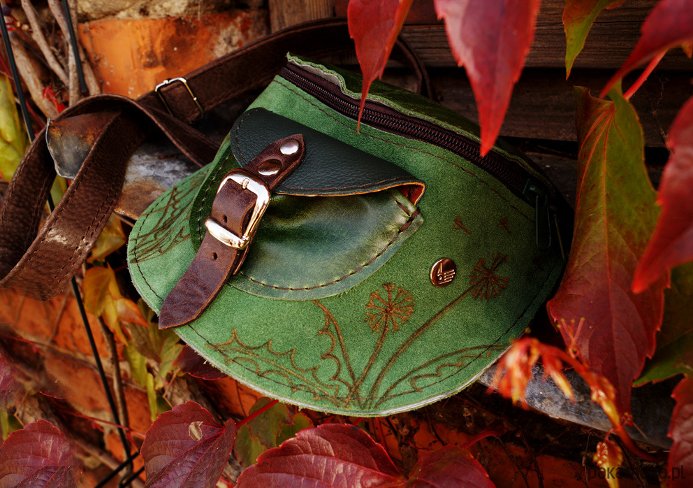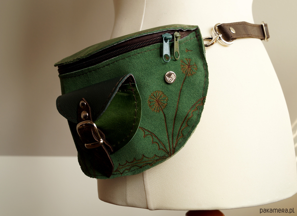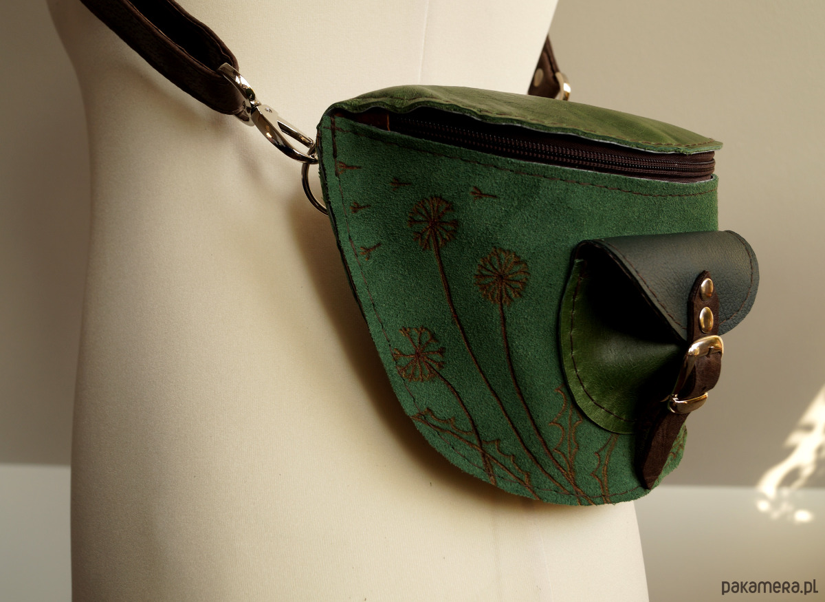 Praktyczna torebka na pas uszyta z zielonych skór naturalnych o różnych odcieniach i fakturach. Ręcznie wypalony motyw polnych kwiatów. Niewielka ale pojemna, pomieści telefon, portfel, chusteczki i najpotrzebniejsze kosmetyki. Z tyłu jedna, a z przodu dwie niewielkie kieszenie. Wewnątrz przegródka. Sprzedawana w komplecie z regulowanym paskiem zapinanym na karabińczyki. Można ją nosić również na ramieniu. Wymiary: 21/17cm.