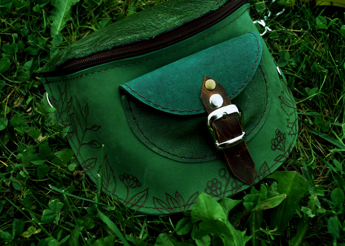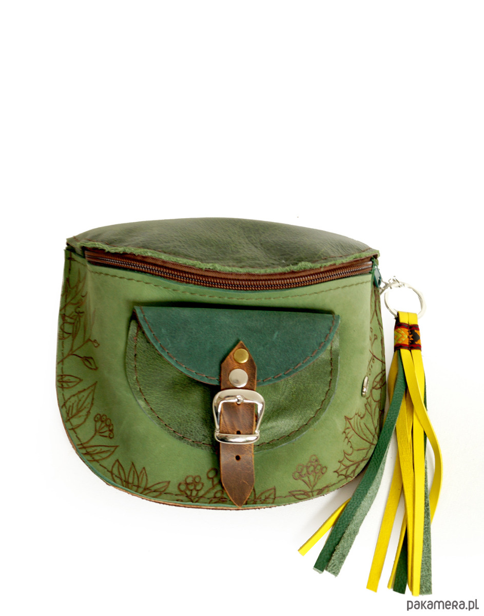 Praktyczna torebka na pas uszyta z zielonych skór naturalnych o różnych odcieniach i fakturach. Ręcznie wypalony motyw jesiennych liści. Niewielka ale pojemna, pomieści telefon, portfel, chusteczki i najpotrzebniejsze kosmetyki. Z tyłu jedna, a z przodu dwie niewielkie kieszenie. Wewnątrz przegródka. Sprzedawana w komplecie z regulowanym paskiem zapinanym na karabińczyki. Można ją nosić również na ramieniu. Wymiary: 21/17cm.