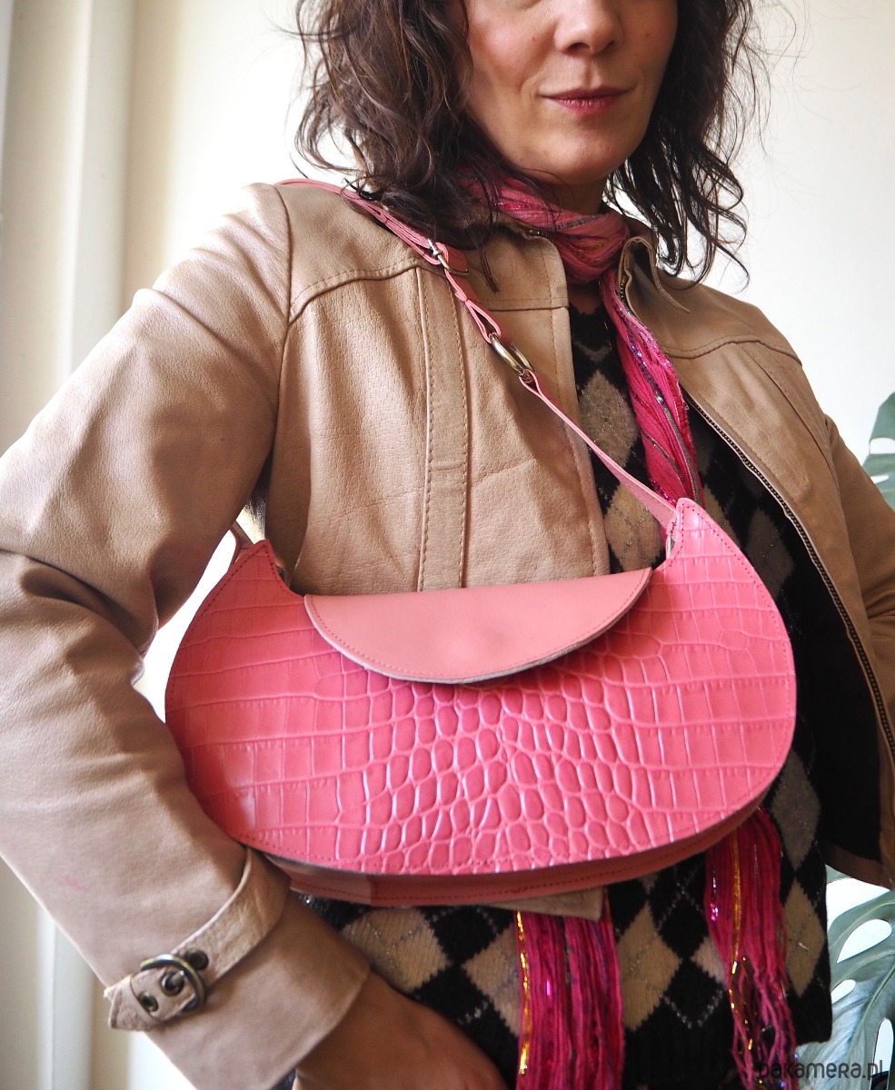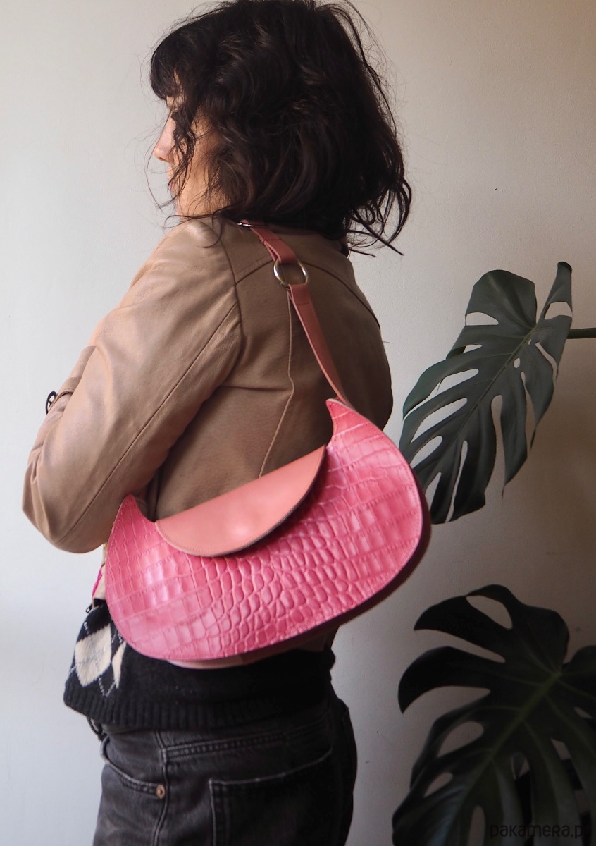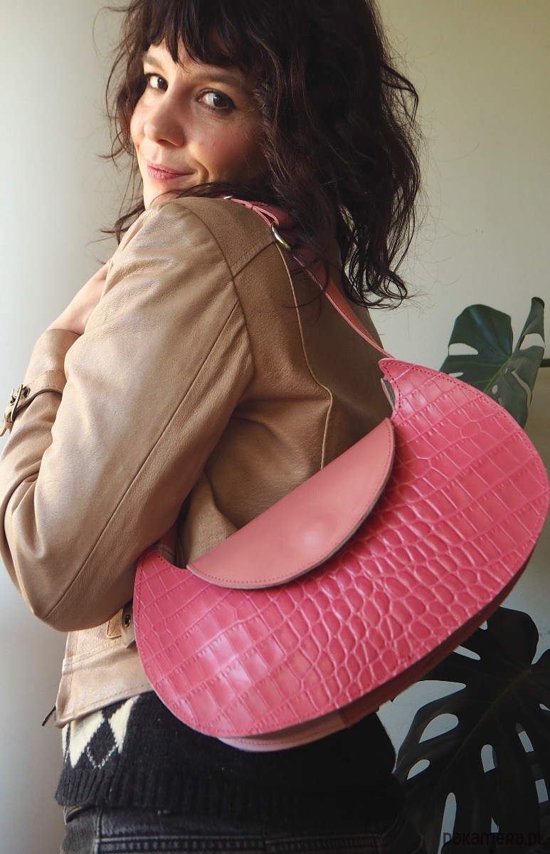 Skórzana różowa torebka rogalik z recyklingu krokodyl