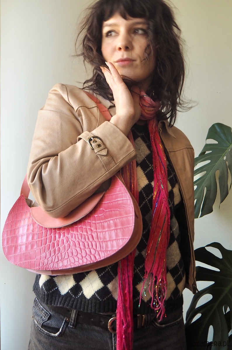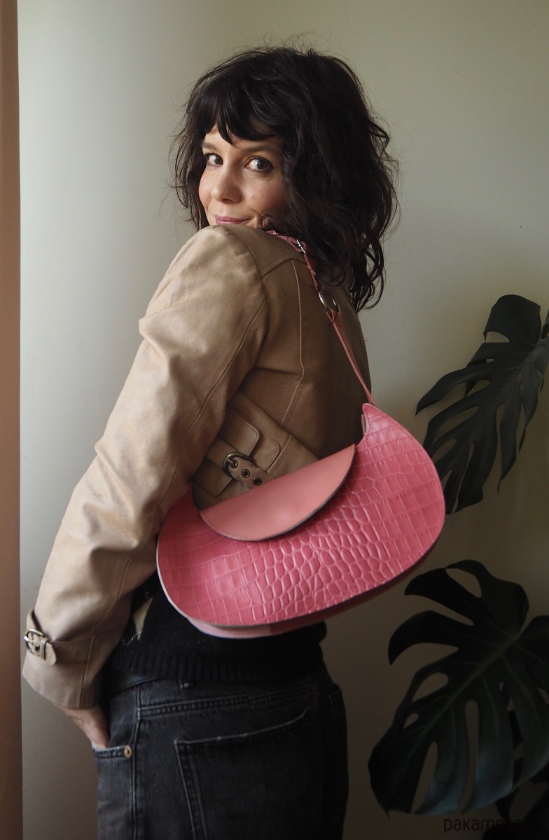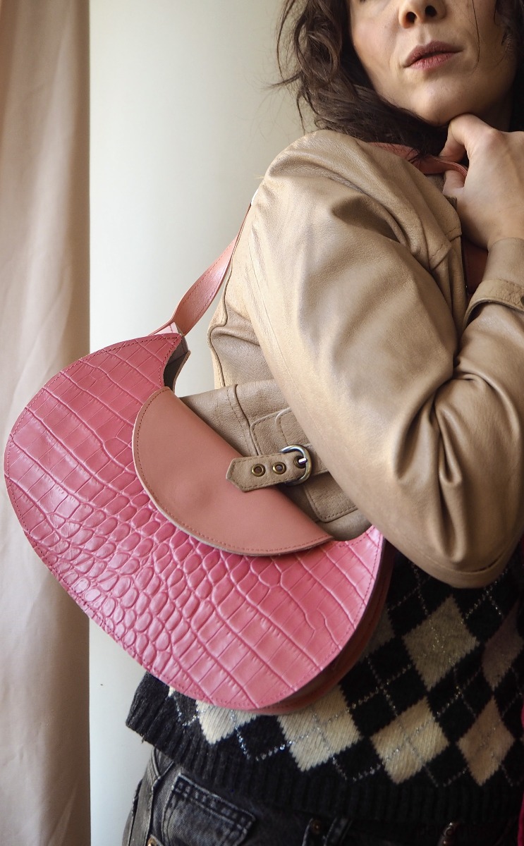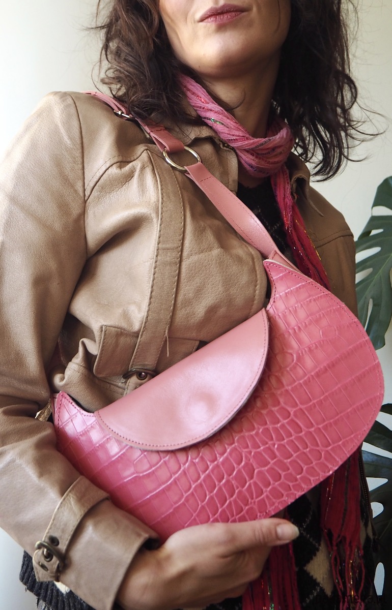 Skórzana różowa torebka rogalik z recyklingu krokodyl