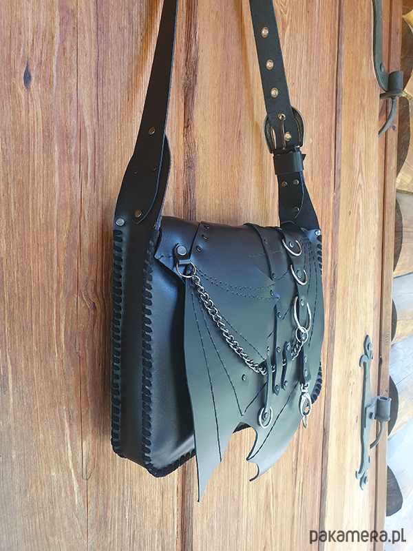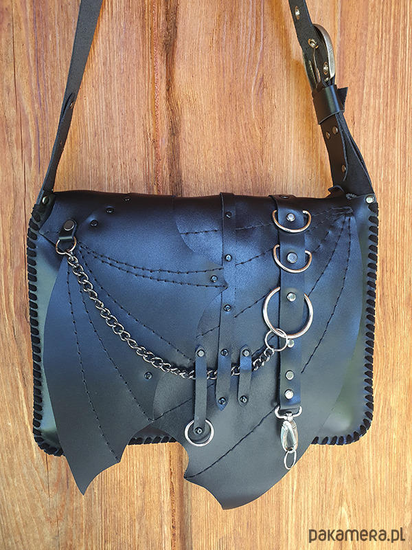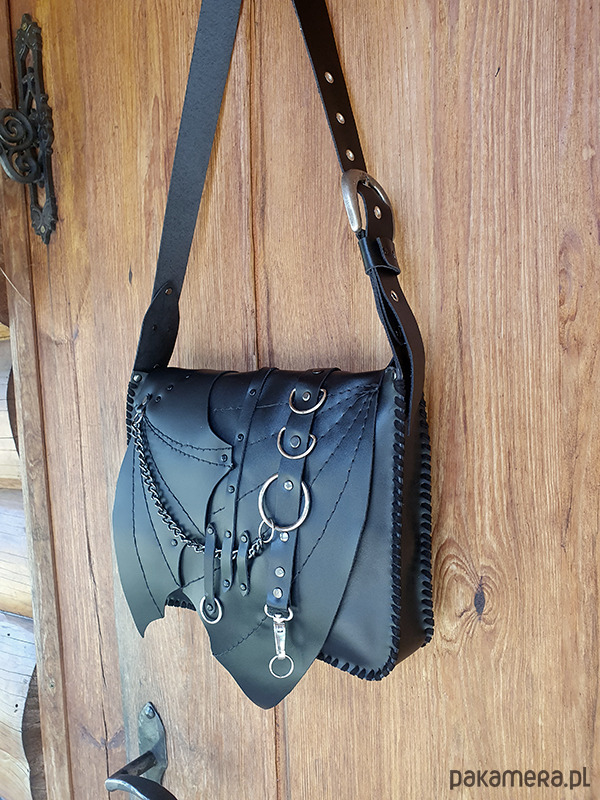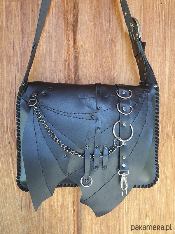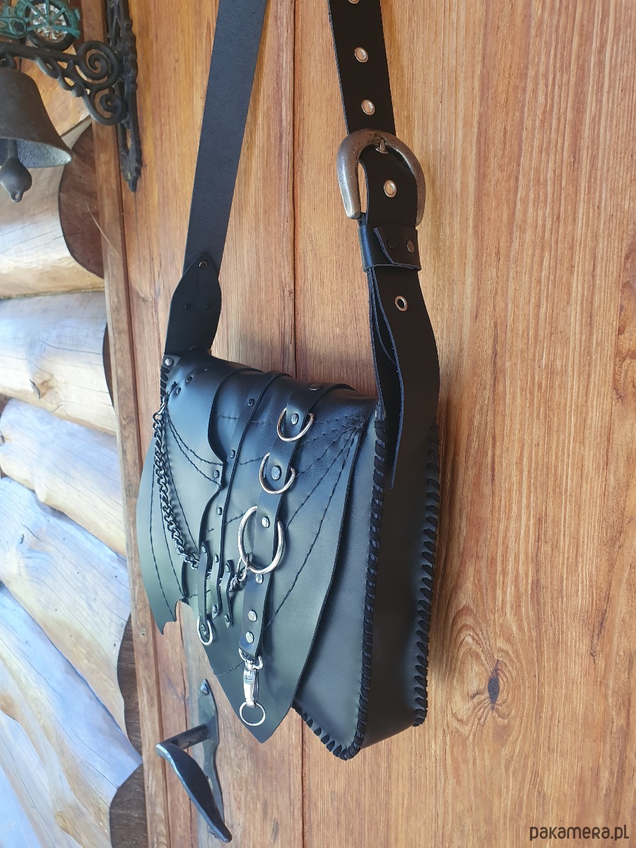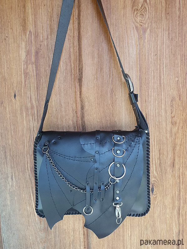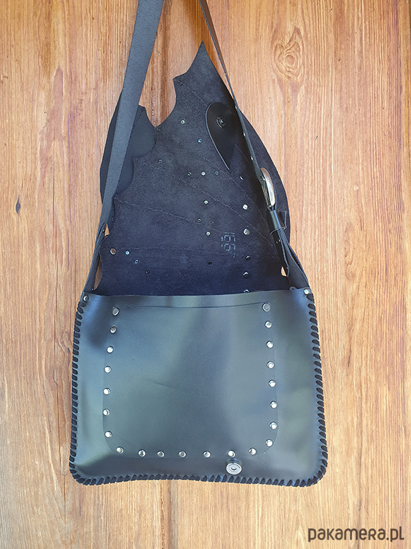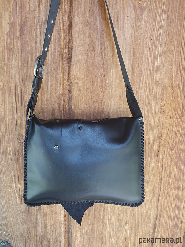 Metalowe dodatki, ręczne szycie rzemieniem tworzą niepowtarzalny charakter torby.